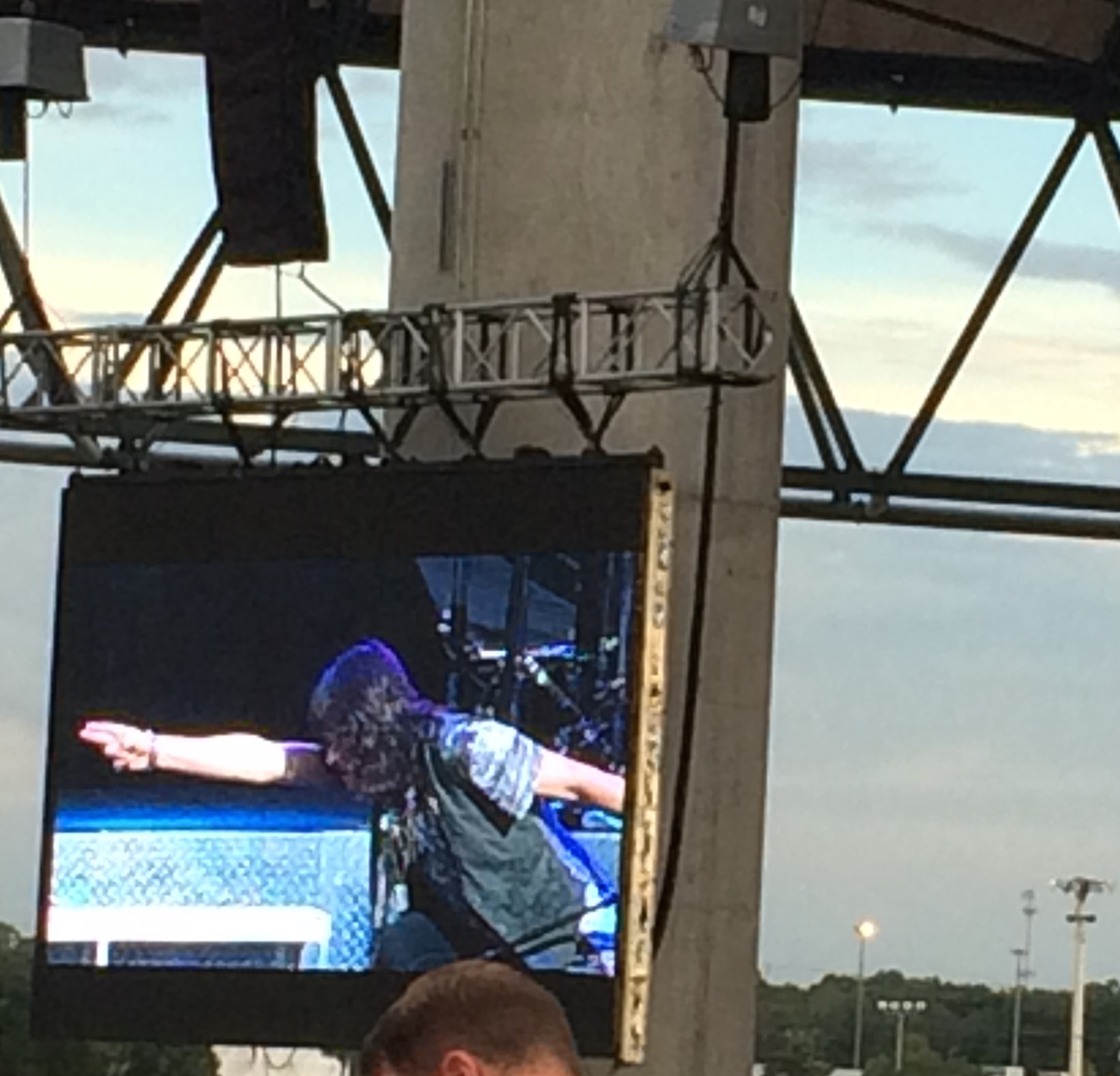 We had lawn seats and there a threat of mud, but it all ended up being perfect. If you don’t mind humidity, which I don’t. The sky had stormy overcast shades of blues and grays, and oranges and yellows, with a sliver of a new moon clearly visible. There was an occasional breeze. We had lawn seats – I love to stand and rock out with all my friends around and not be trapped in a seat area. There was an amusing couple next to us – the guy had this uncanny and patient ability to keep his wife upright the entire show – whether she was momentarily passing out or trying to rock out and not fall over.