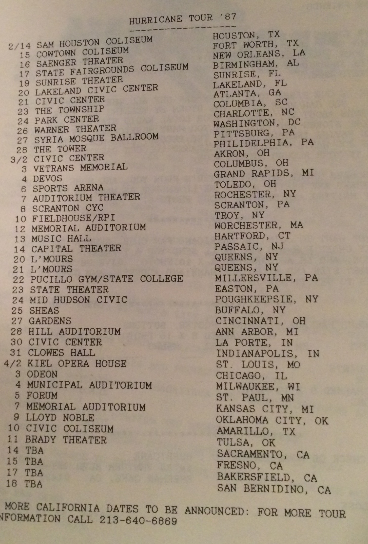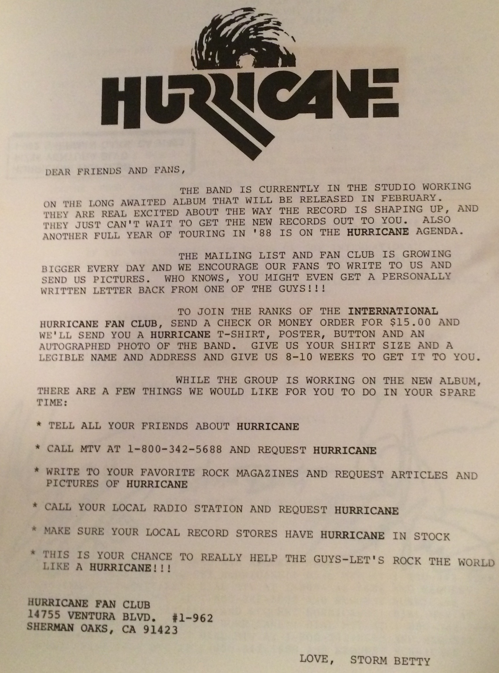 I have no idea how, but I’ve managed to save these Hurricane fan club flyers that we used to get in the mail. Luckily I’m a lot better at organizing than at remembering. Back then bands would have a hot girl or guy walking around with a clip board getting names, addresses and phone numbers.