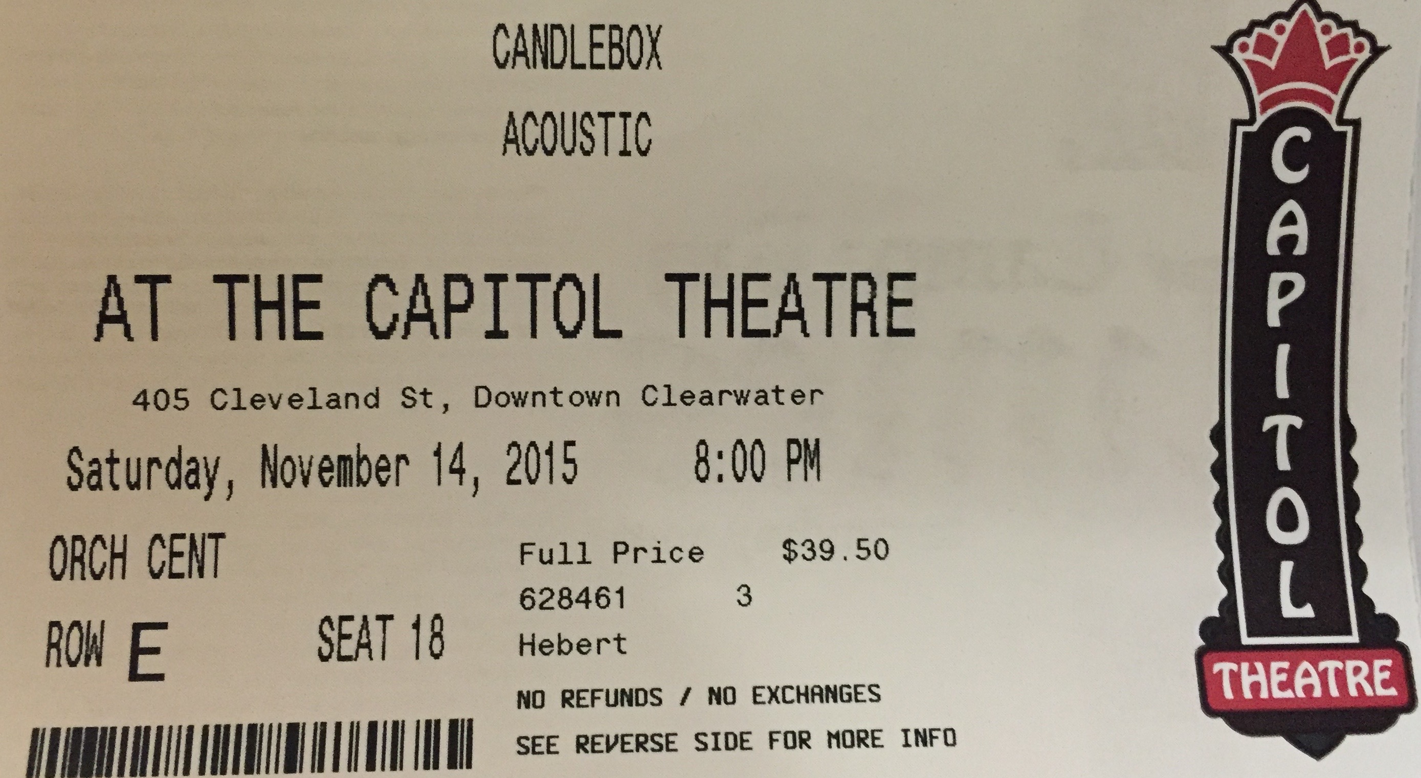 We learned that his ex-wife is a scientologist, which he had mentioned when Candlebox played in downtown Clearwater in 2013 or ’14 (I can’t find that ticket stub). The Capitol Theatre is smack dab in the midst of scientology’s worldwide headquarters. It’s a cute little downtown with a weird vibe – but I appreciate Ruth Eckerd Hall’s restoration of the historic theater and attempt to revive the area.