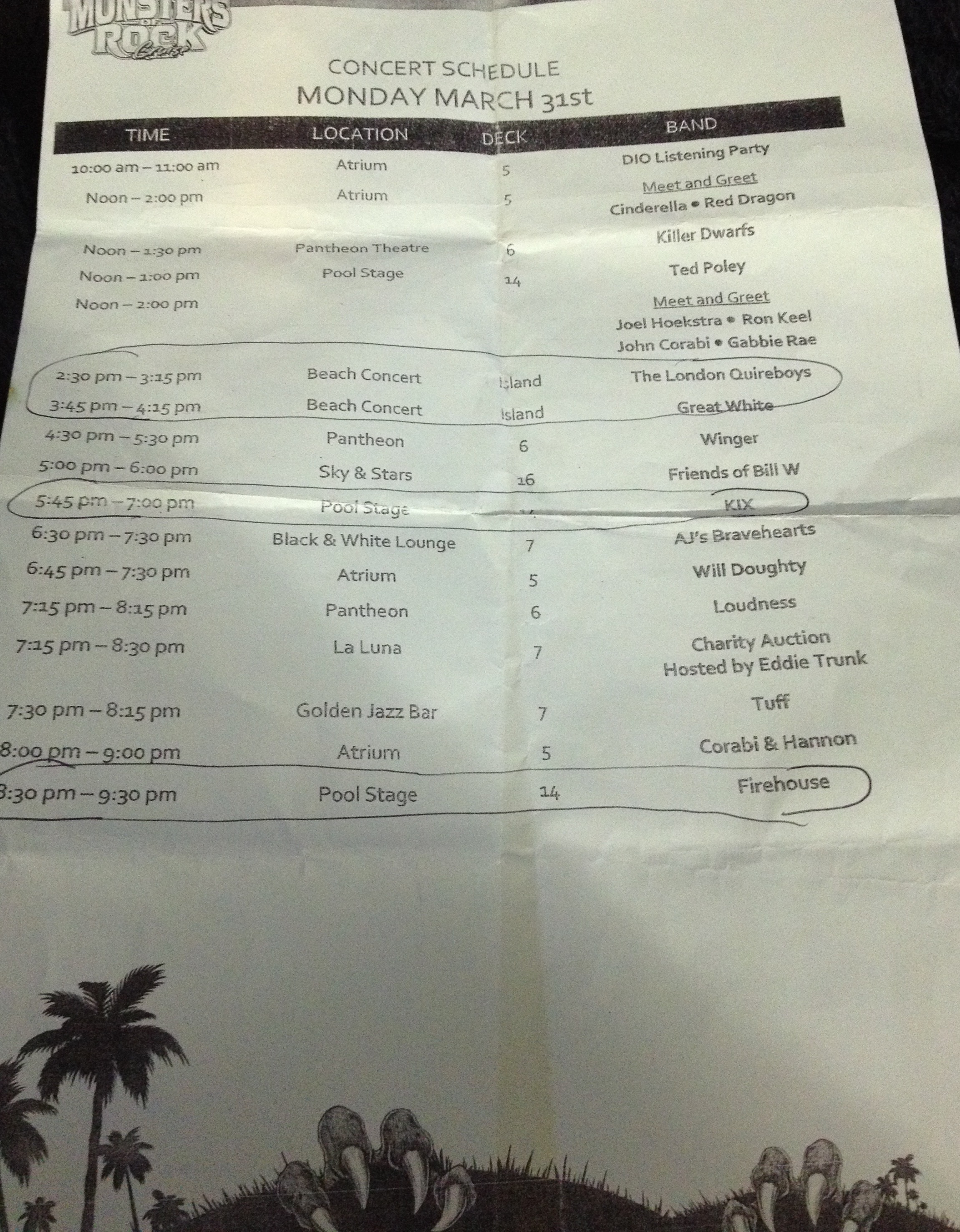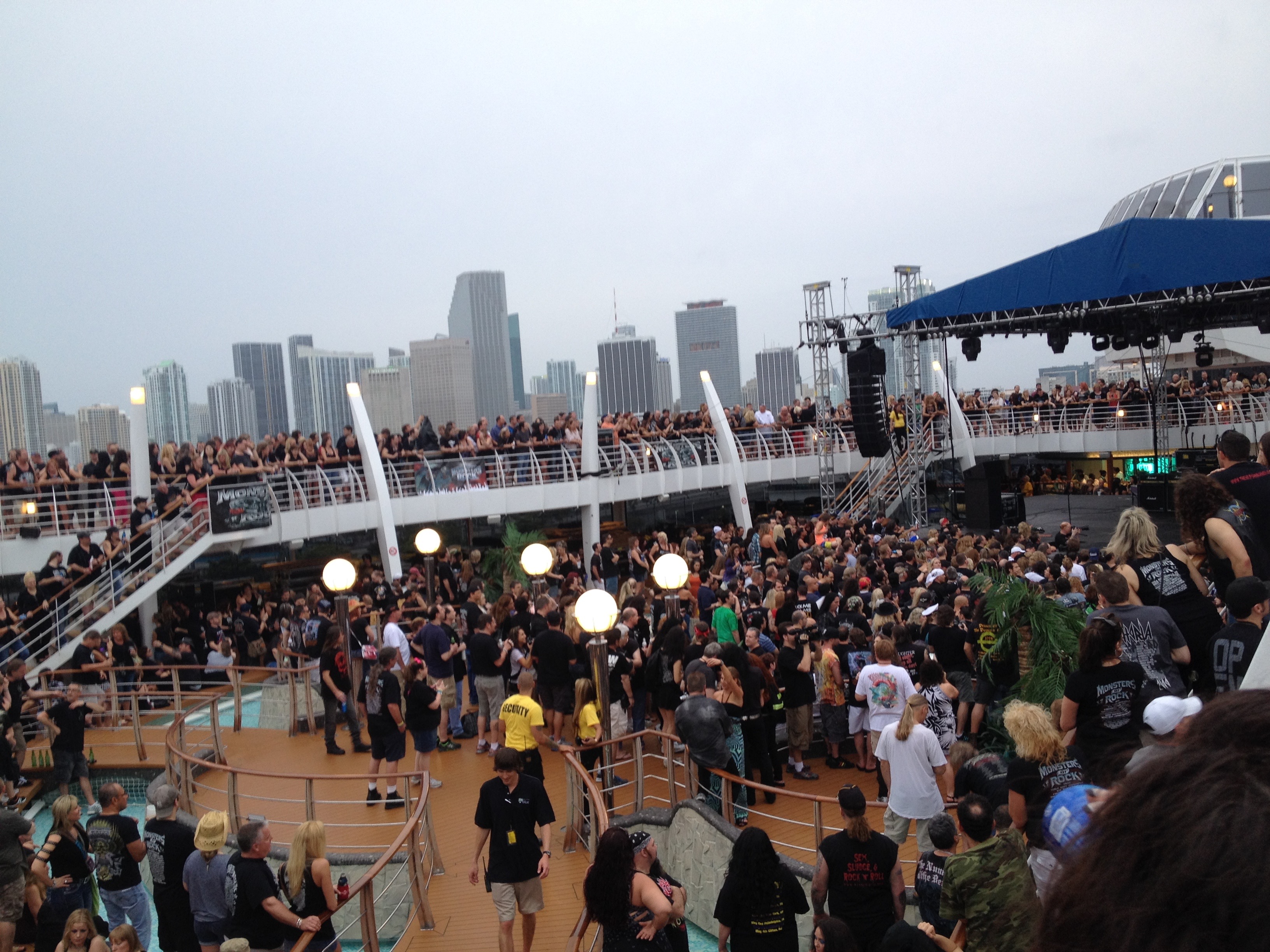 We flew into Miami from Tampa on Thursday and went to the Rockerz Pool Party to see Burning Rain and Trixter that night – interesting and fun event. Friday night was the Monsters of Rock Cruise Pre-Party with Kix at a dive-y dog track called the Magic City Casino (which has since been nicely remodeled). Kix was awesome, as usual…and the salsa-dancing crowd inside after the show was amusing. We met up with other cruise friends here so it was a preview of the good times to come.