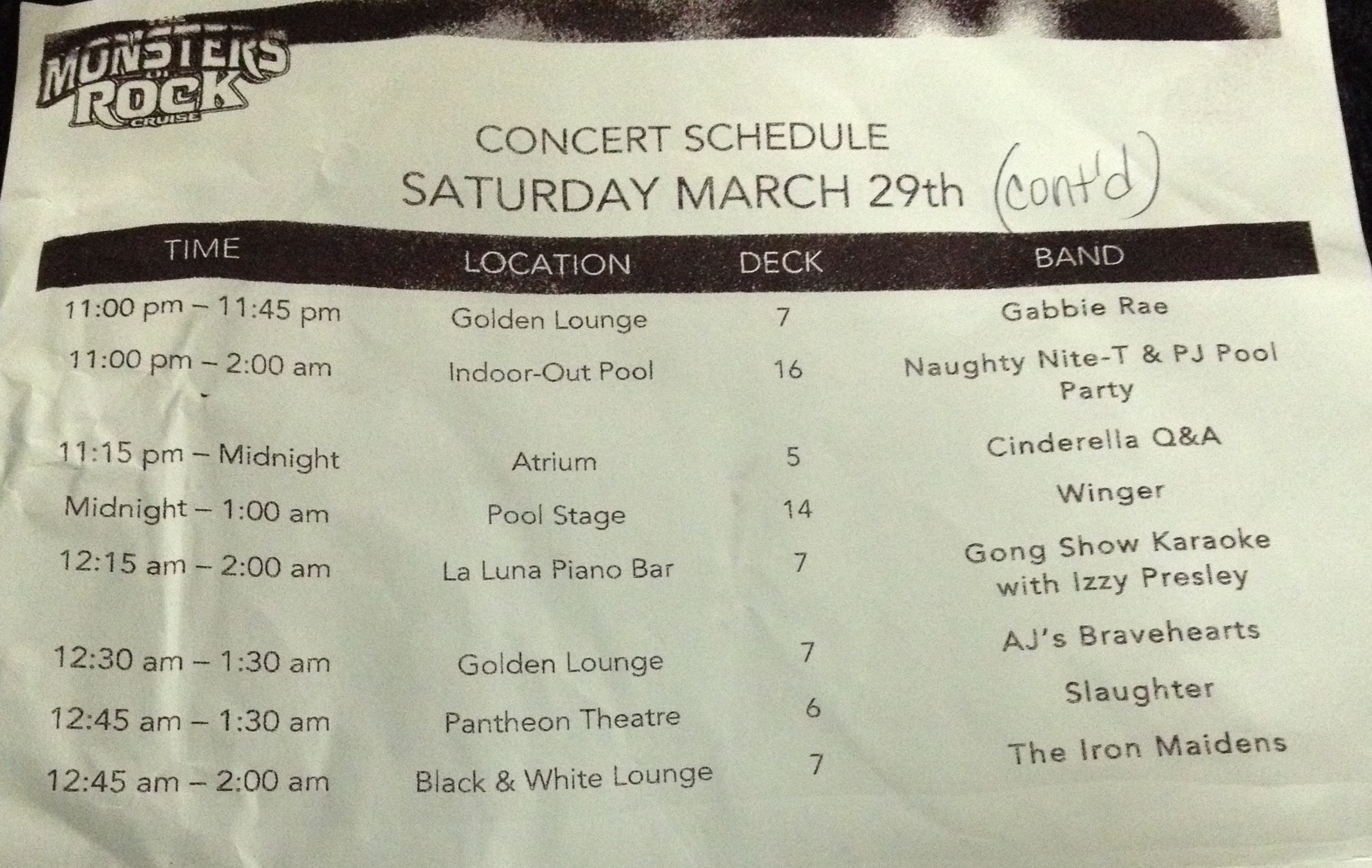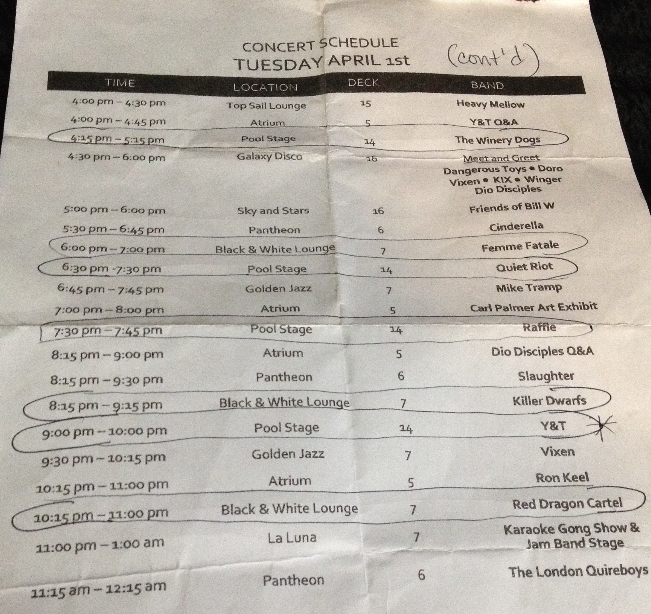 What did I miss? I didn’t go to any of the Q&A sessions, which they had for almost every band; I didn’t go to any of the meet-n-greets where you could get autographs and have your picture taken with the band. I didn’t see Cinderella – as far as I could tell they only played in the theater and that was my least favorite place to see a band. I did see Vixen there at some point, which I think I failed to mention above. Most of the main bands did one show on the pool stage, one in the theater and/or one in the Black & White Lounge or Golden Lounge, so you had more than one opportunity to see bands.
