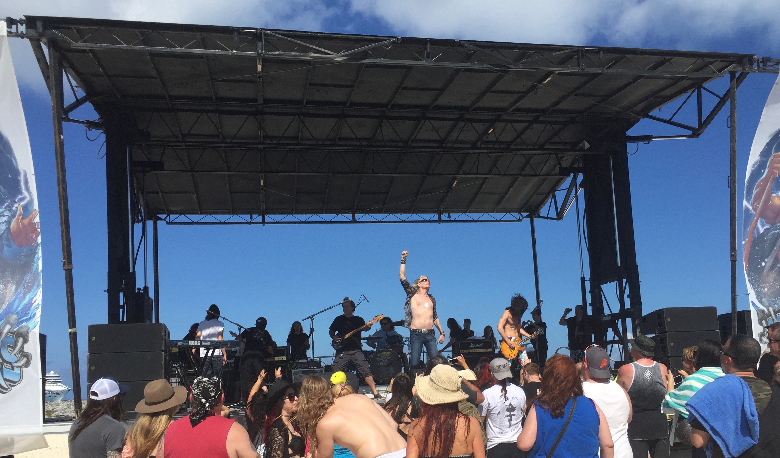 Thursday morning started with Vinnie Moore at the pool stage. It was an odd weather day – after days of sunshine, Nassau was like a cold, grey frozen tundra (this from a Florida girl, so take it with a grain of salt – it was windy and in the 50s). Next up on the pool stage was a great new discovery to me, Hardcore Superstar. Crazy blend of the best 80s bands and stage energy.