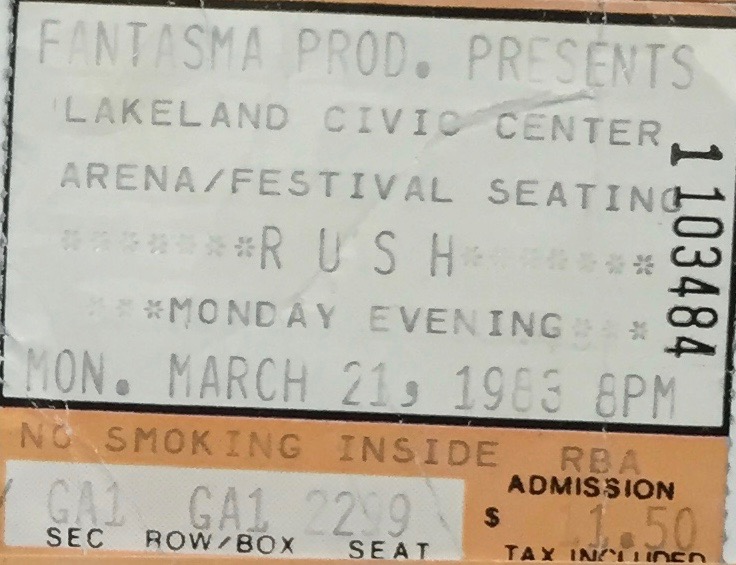 Rush with John Butcher Axis on 3-21-1983 at the Lakeland Civic Center Arena in Lakeland, Florida. Cost $11.50.
