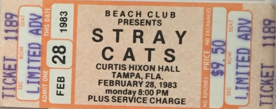 Stray Cats with the BusBoys on 2-28-1983 at Curtis Hixon Hall in Tampa, Florida. Cost $9.50. One of the few shows I went to at this venue, which has hosted some legendary bands, including Led Zeppelin, The Doors, Jimi Hendrix, and Elvis. Check out The Concert History of Curtis Hixon Hall.