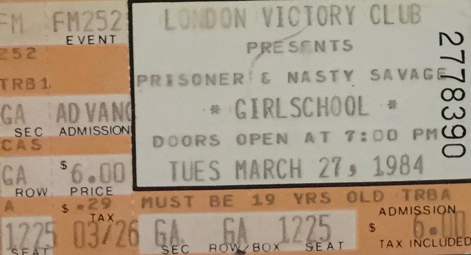 Heart with Helix on 2-12-1984 at the Tampa Jai Alai Fronton in Tampa, Florida. Cost $11.50. Ozzy Osbourne with Motley Crue on 2-23-1984 at the Lakeland Civic Center in Lakeland, Florida. Cost $12.50. I believe this was the tour stop at which Ozzy snorted ants, as told in The Dirt (Motley Crue band bio). Blue Oyster Cult with Aldo Nova on 3-18-84 at the Lakeland Civic Center Arena in Lakeland, Florida. Cost $12.50. Ah, one of our funniest stories – one that involves Aqua Net and Aldo Nova’s band members – happened behind this stadium that night ;oD. I love Aldo Nova’s Fantasy album – great road trip music.Motley Crue record signing event at Peaches Records & Tapes in Clearwater, Florida in 1984 (I’m pretty sure anyways, even though I wrote 1983 on the back of the photo). I can’t seem to find the exact date for this event, but I recall the store was a madhouse – I don’t think they expected the huge crowds that showed up. Notice the lack of sleeve tattoos. Yes, I did some pretty tight photo-snipping-collaging at some point – sorry about that. Girlschool with Prisoner & Nasty Savage on 3-27-1984 at the London Victory Club in Tampa, Florida. Cost $6.00. Prisoner was a local band featuring singer Kevin Steele of Roxx Gang. Nasty Savage was a local band from the world-famous Brandon (suburb of Tampa) death metal scene – I seem to remember the singer smashed tvs over his head.Ted Nugent with ? on 4-12-1984 at the Tampa Jai Alai Fronton in Tampa, Florida. Cost $12.00. I distinctly remember Bon Jovi was supposed to open and that’s why we were going, but then he blew up and went out on his own tour. But I ended up loving Ted’s singer Brian Howe, who sang on that tour (and who later ended up singing many hits for Bad Company in the ’90s). He sang on Side One of Ted’s Penetrator album, the most unheard of, but my favorite, Ted album (Side One anyways) – I have some of those songs in my workout folder today. Ozzy Osbourne with Motley Crue on 5-20-1984 at the USF Sun Dome in Tampa, Florida. Cost $12.50. Only a short time after they played in Lakeland in February – a very motley era. Slayer with Savage Grace and Thrust on 6-21-1984 at the Country Club in Reseda, California. Cost $6.50. I believe we went to see the band Thrust but I’m not sure. I can recall being at the Country Club for various shows but I simply don’t recall being there for any specific show. Another odd memory fail. Icon on 6-26-84 at the Country Club in Reseda, California. Cost $6.50. I don’t remember anything about this band, and Setlist.fm doesn’t have information on who the “RO” that is cut off might be. If anyone knows, please tell me. UPDATE: Thanks go to #analogkid6103 for letting me know that RO is Romeo, and that this was the KMET People’s Concert with Icon and Romeo! Aerosmith with Black ‘N Blue on 8-26-1984 at the Greek Theater in Los Angeles, California. Cost $15. Thank goodness I wrote who it was on there in my 1984 handwriting, and thanks to setlist.fm for confirming the place and time. I have a vague recollection of trees when it comes to this venue. I love Black ‘N Blue. Hello! Miss Mystery! Helix on 9-12-1984 at the Roxy Theatre in Los Angeles (Hollywood?), California. Cost $11. Give me an R… I don’t remember much about this show, but my bff tells me she went despite having a 102 degree fever. Ah, youth. Quiet Riot with Armored Saint & Whitesnake on 9-29-1984 at the Fabulous Forum in Los Angeles, California. Thanks to rocktourdatase.com for info on the opening bands as I did not write that on the ticket, nor do I remember. Not sure if I didn’t go and that’s why it’s a full ticket…? But bff tells me we went to a party at Carlos Cavaso’s house afterwards, and I think I remember that – at a house slightly up the canyon off Ventura somewhere. We may never know ;o/Billy Squier with Ratt on 10-25-1984 at the Lakeland Civic Center Arena in Lakeland, Florida. Cost $13.75. Back home in Florida.Busch Gardens Halloween Rock Party on 10-26-1984 in Tampa, Florida. Cost $8.95. I can’t find anyone or anything that tells me who played at this show – but I remember going to see someone good. Setlist.fm shows the 1982 version as featuring local band Stranger and 1983 featured Savatage. It skips over 1984 – can anyone tell me who played?!REO Speedwagon with Zebra 12-14-1984 at the Lakeland Civic Center Arena in Lakeland, Florida. Cost $13.50.Brooklyn Brats with Ruby Slippers & Rude Awakening on 12-29-1884 at the Country Club in Reseda, California. Cost $7. I’m still wondering why I went back to L.A. for this trip – maybe to spend New Year’s Eve there? Bff says one us was seeing someone in Ruby Slippers and who later became her roommate. I’m glad some of us remember some things, geez.