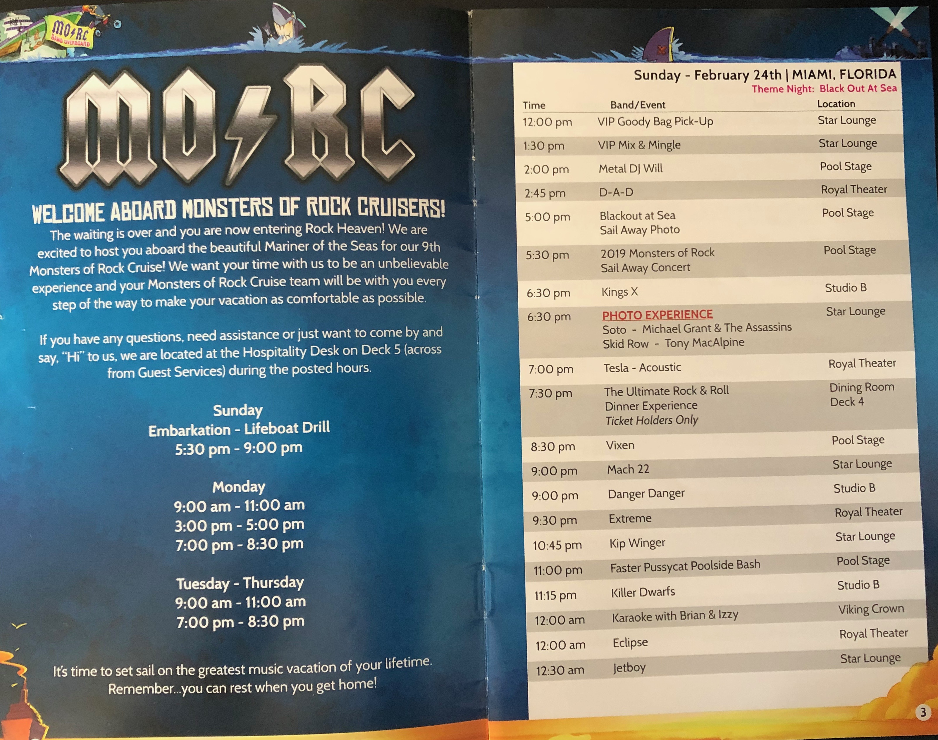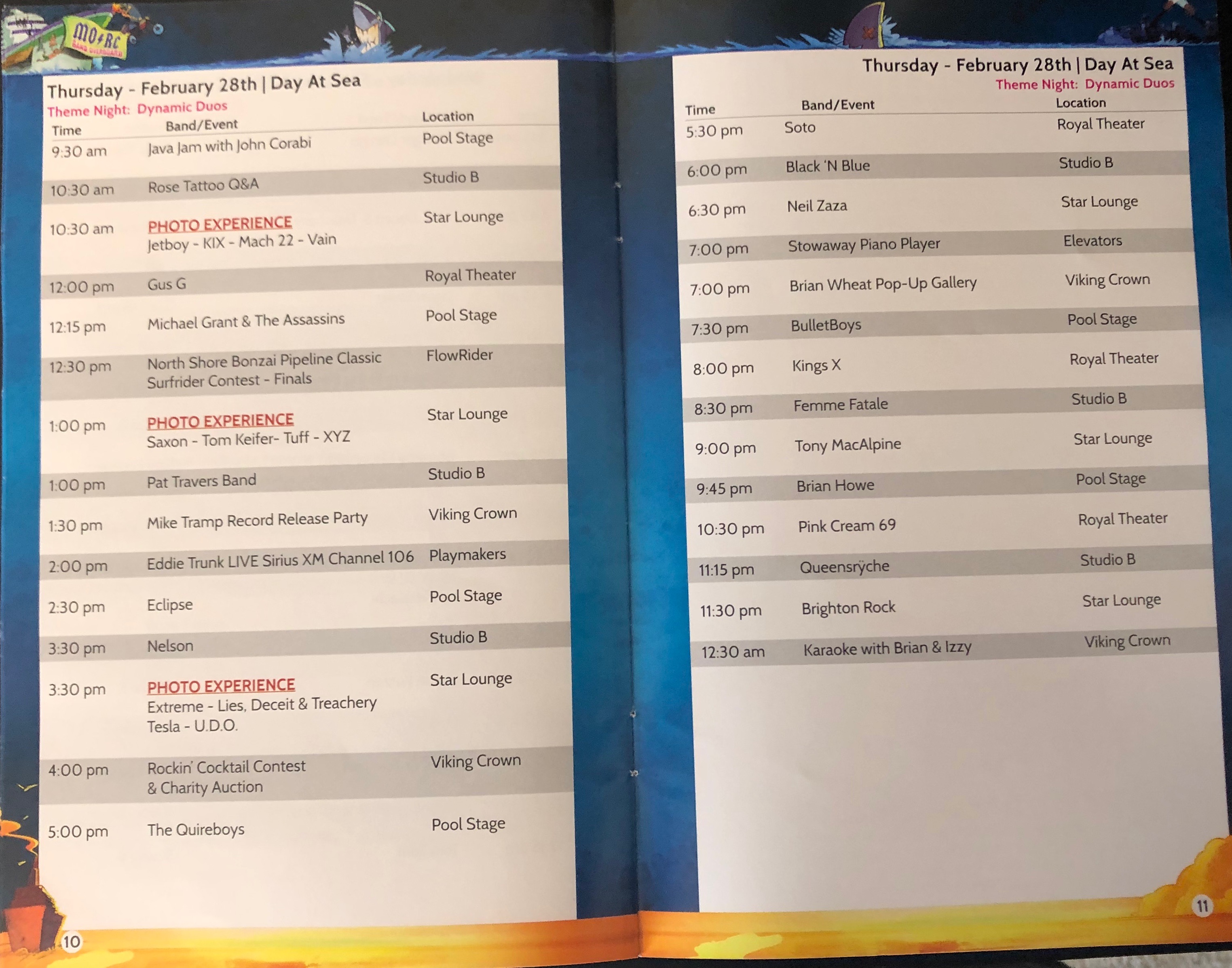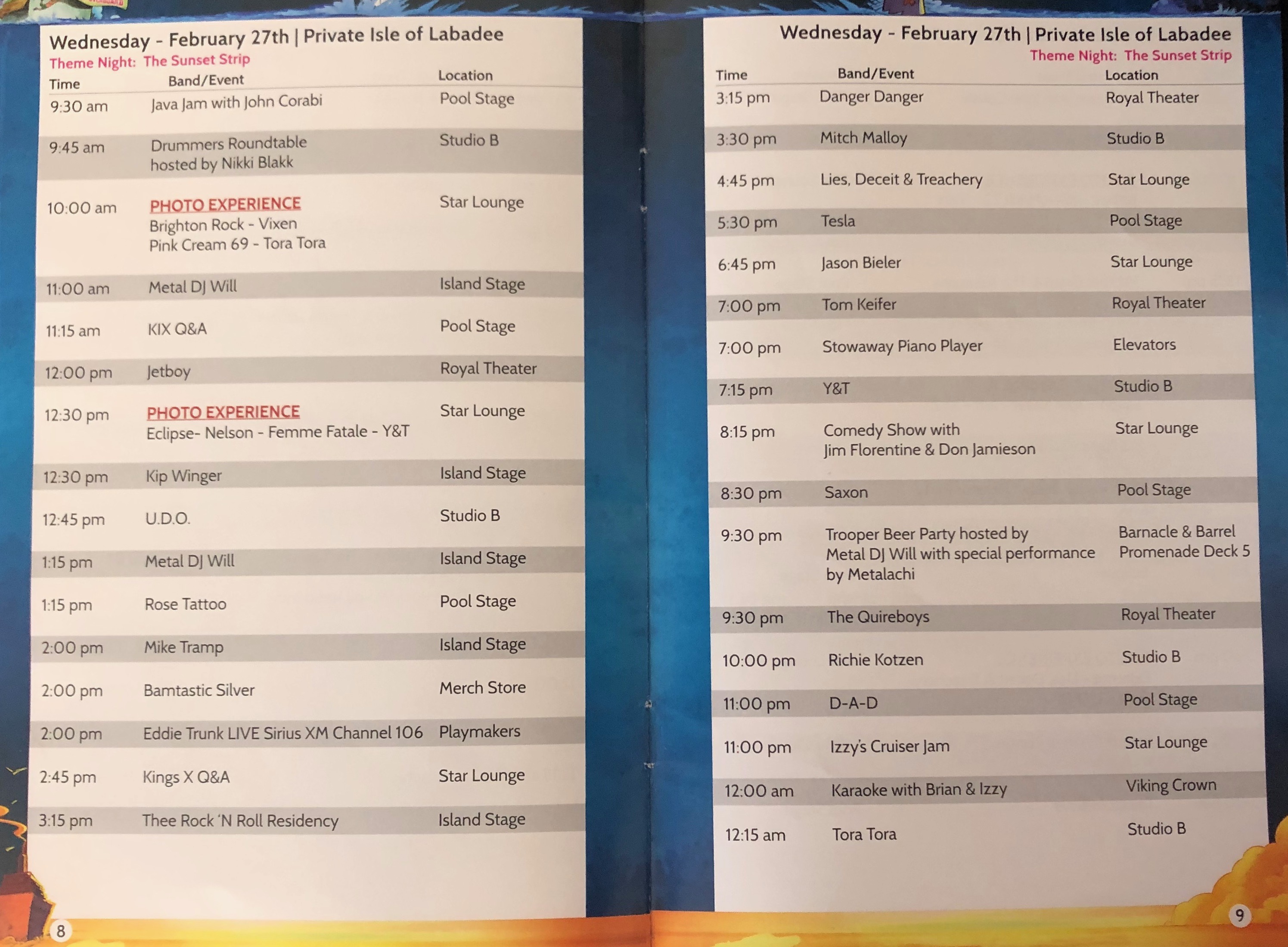 Here are the original band schedules…there were a few modifications as Extreme had to reschedule and D-A-D couldn’t make it to the cruise.