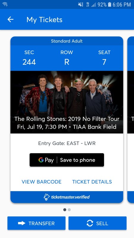 The Rolling Stones with the Revivalists on 7-19-2019 at TIAA Bank Field in Jacksonville, Florida – Digital Ticket Screenshot. Cost +-$150.00.