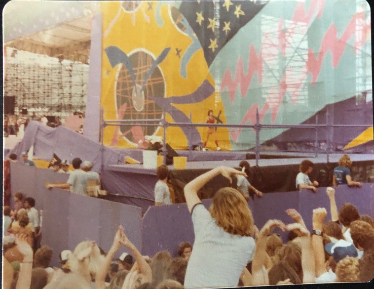 I put this photo first as the guy or gal who is managing to sit on someone’s shoulders, smoke a cigarette, and take a photograph at the same time is modeling the exact type of camera I was using – some type of Kodak Instamatic 110 model. I apparently snuck it in, though that was not nearly as elaborate of a camera story as that of Timmy Mccrum on the Van Halen News Desk: he went into the stadium days ahead of the show and stashed his camera equipment in the “bowels” of the stadium.