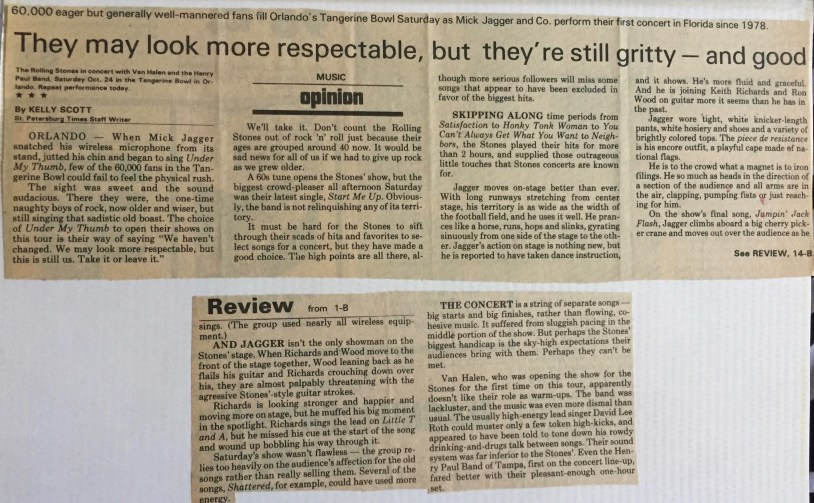 St. Petersburg Times Rolling Stones review by Kelly Scott. Sadly, I have to agree with the Van Halen review (just because of DLR). For more on that check out my post The Chronicles of a Van Halen and Sammy Hagar Fan 1979 – 2017.