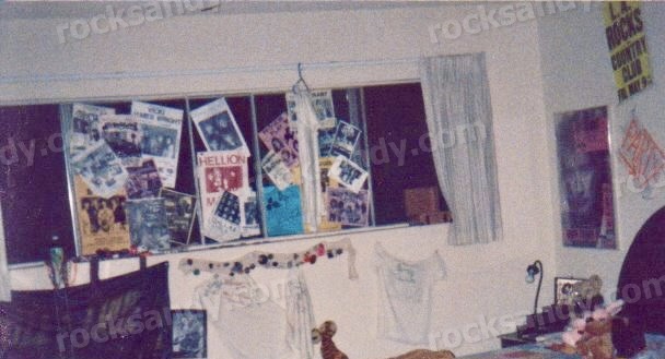 PERSONAL PHOTO: A fuzzy look at our messy North Hollywood apartment’s “bedroom window treatment” circa 1986. I wish it was clearer so that I could make out more of the flyers. I can only make our Hellion clearly. Check out the button-laden scarf and autographed tshirts – I know one was Randee’s and was signed by Tommy Lee at Peaches Records & Tapes in Clearwater, Florida before it got moved to L.A.