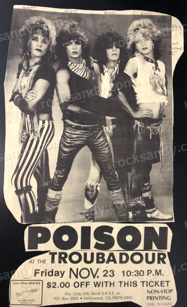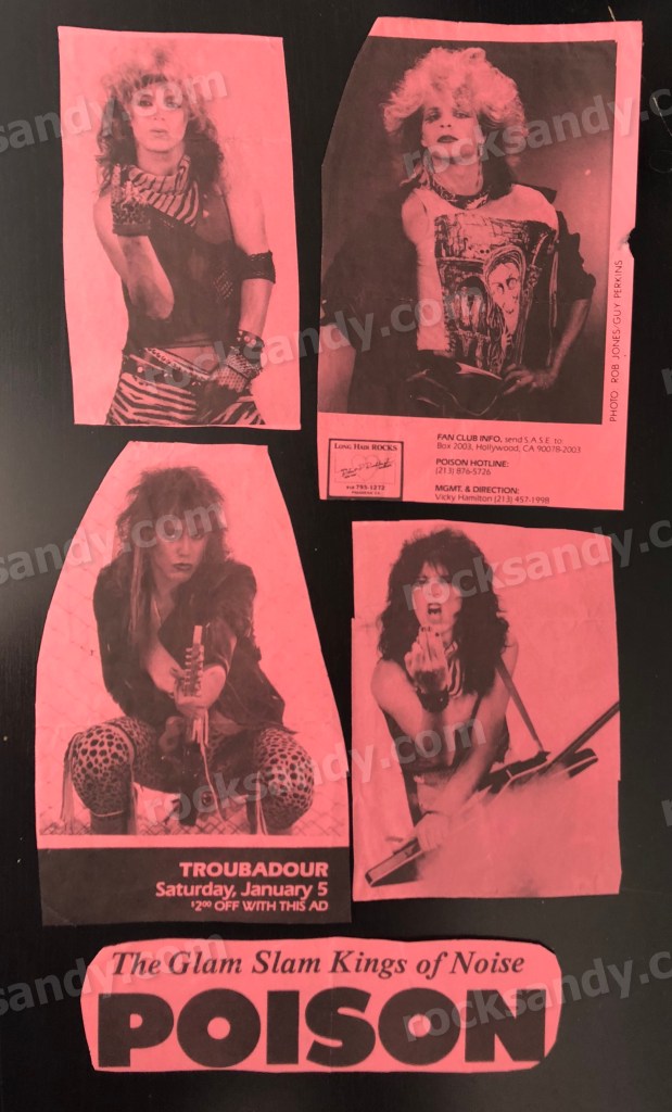 Sorry about the 1980s scrapbooking go fast-induced cut-up. Note the original line-up, before CC joined Posion. Anyone else remember Long Hair ROCKS in Pasadena? Robert something and his letterology thing?