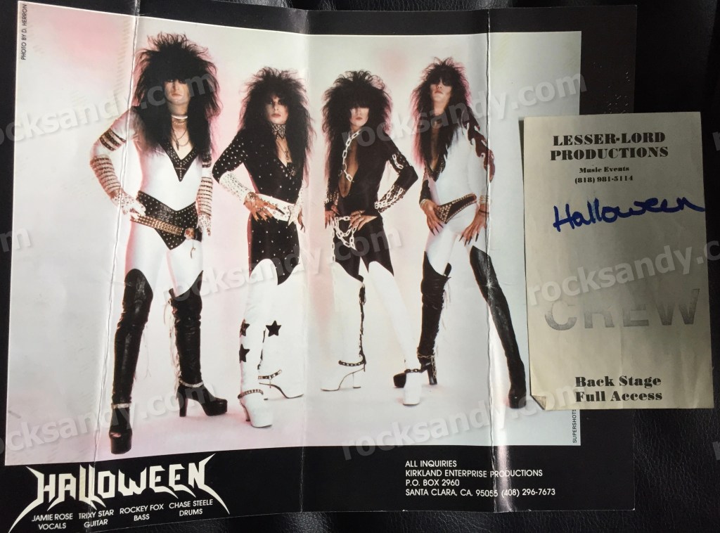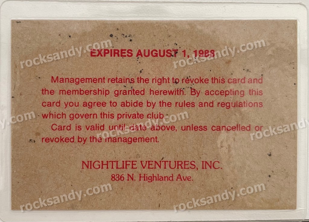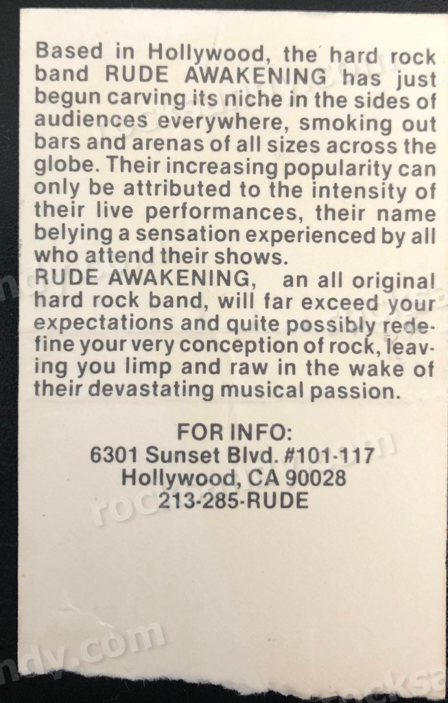 I don’t remember much about this band either, though the flyer had a crew pass stuck to the back of it (no comment) – but I want to say it involved the Rainbow‘s party-in-the-parking lot. I googled the made-up band member names and came up empty, but talk about good hair…
