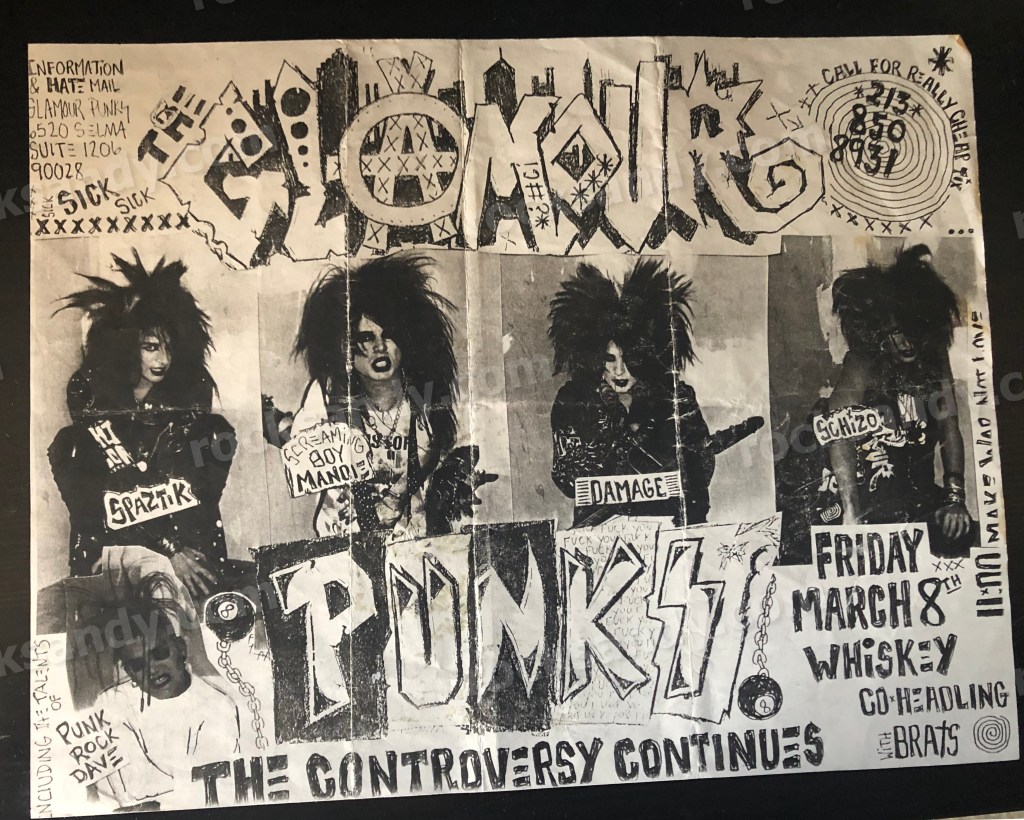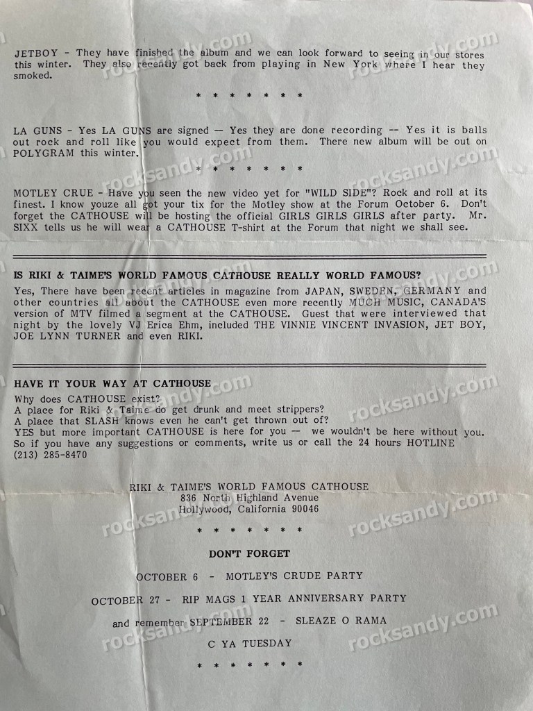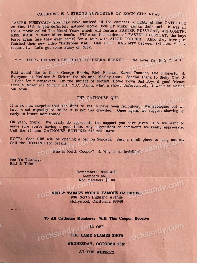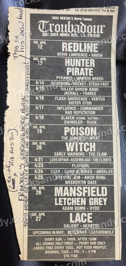 I’ve posted all of the band/club flyers I’ve managed to hang on to from our good times in the Sunset Strip era below (in alphabetical order). The majority of these were collected from band members handing them out on the Strip or in the Rainbow-party-in-the-parking-lot or other clubs. Some were saved to remember the show date/time/place, some were found wadded up in my purse the next morning, and some are from a friend/roomie.