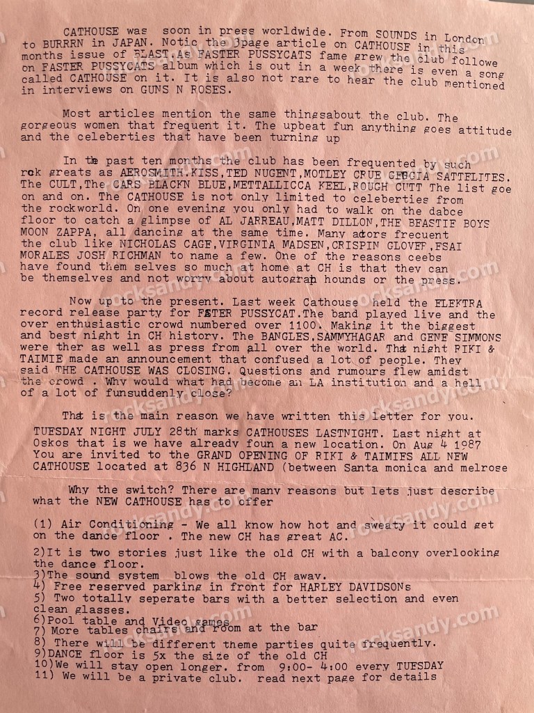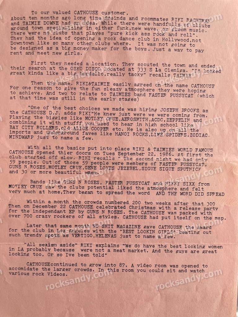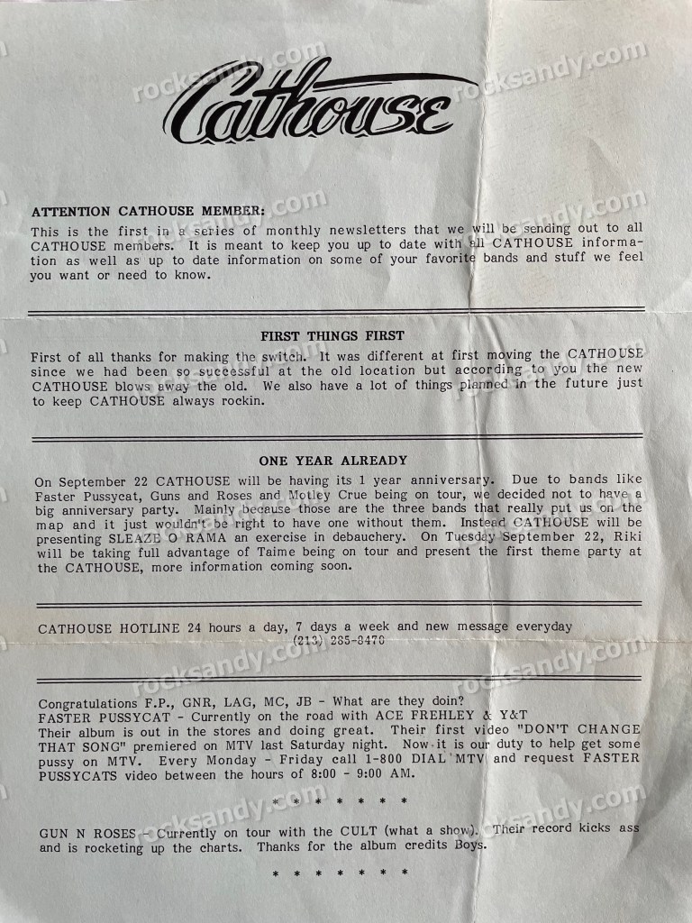 3. OMG! Thank u so much for this! I was there through all that too! I remember u guys. I loved the Cathouse so much and was sad when it closed. Reading this brought back so many memories! I too recall Slash being carried out! LOL I had many friends who just happened to b in bands back then. I was shocked to see Witch listed above because they weren’t as well known as Poison, Warrant, Motley Crüe, etc. I knew all of them and many more. I worked at the Chuck Landis Country Club so I got to meet a lot of bands/people. Brett and Rikki from Poison used to come to my house for lunch with my grandma after I threw an after party for them and 400 people showed up! Including Nikki Sixx and Mick Mars. At that time I threw a LOT of after parties and once it got announced on KLOS. That really shot up my “Productions” career. I wish i could send u the flyers I had but they got burned in a fire and I lost everything I had. Anyways, TY for the memories! While reading I sat here with my daughter telling her about those days and she thanked me for sharing cause it showed her she had a cool mom! LOL