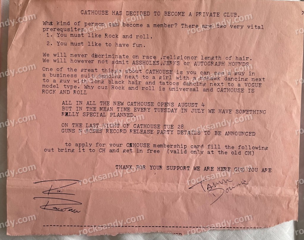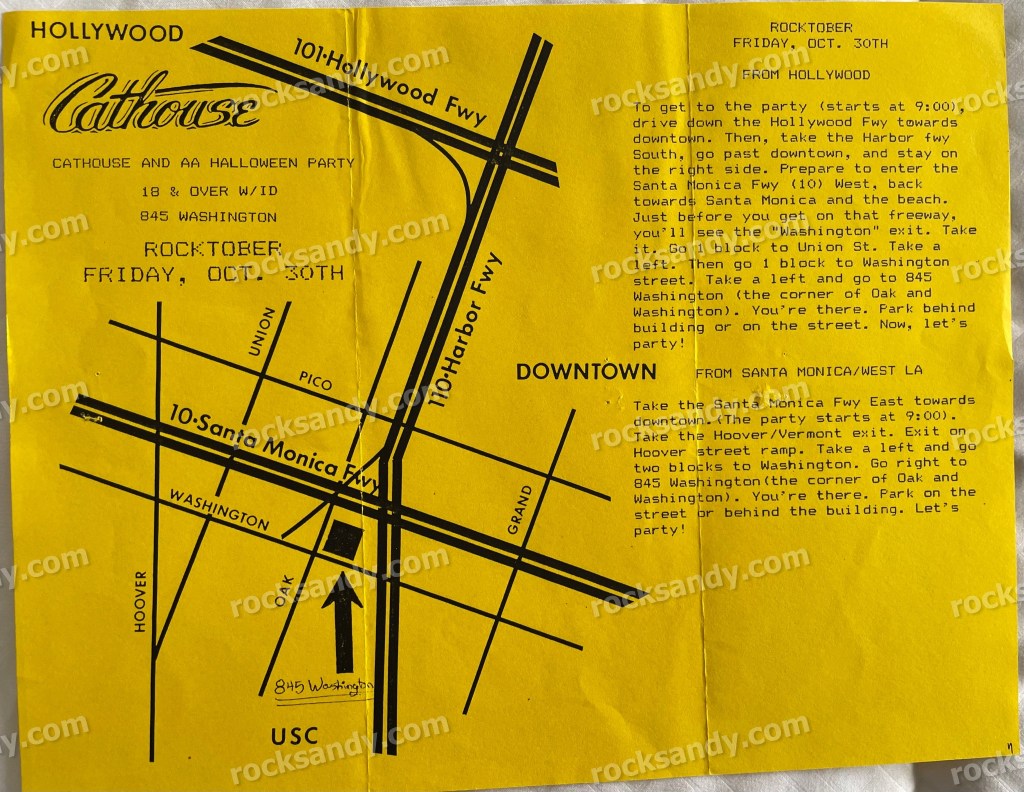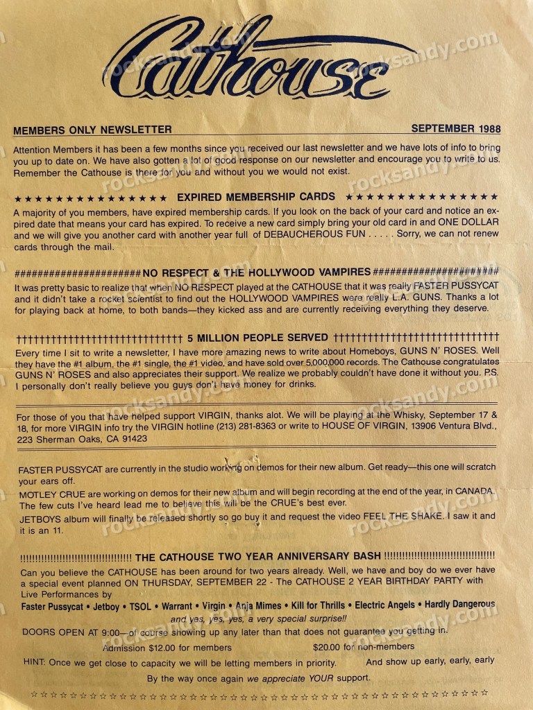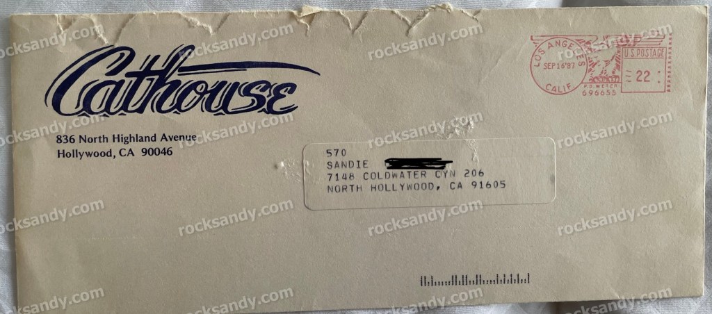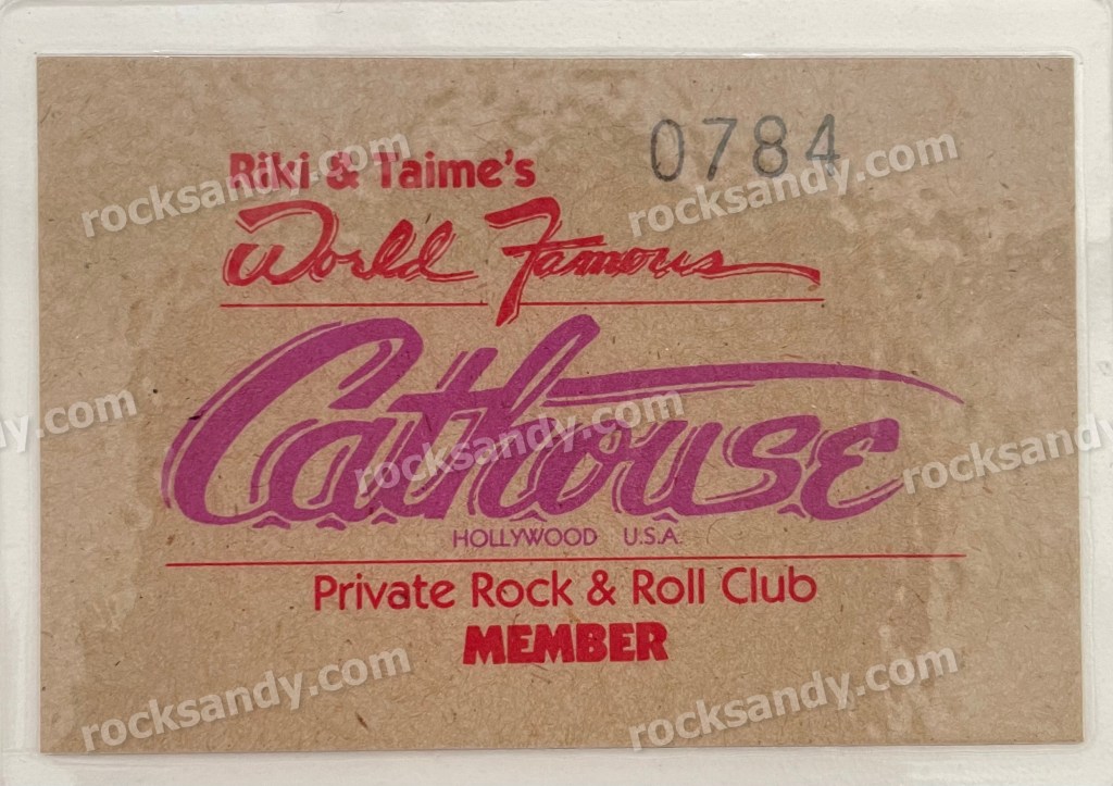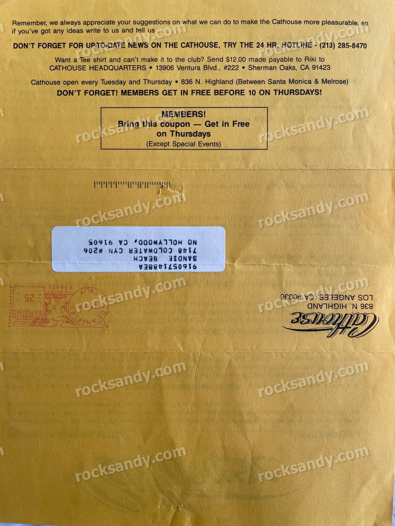 My Riki & Taime’s World Famous Cathouse Hollywood membership card. As a member I received the Cathouse newsletters via U.S. Mail posted below. I can tell from my flyers  that I must have lost my card and got a new one at some point because some are addressed to my real name and some are addressed to Sandie Beach, which I’ve been known to use for fun at times ;o).