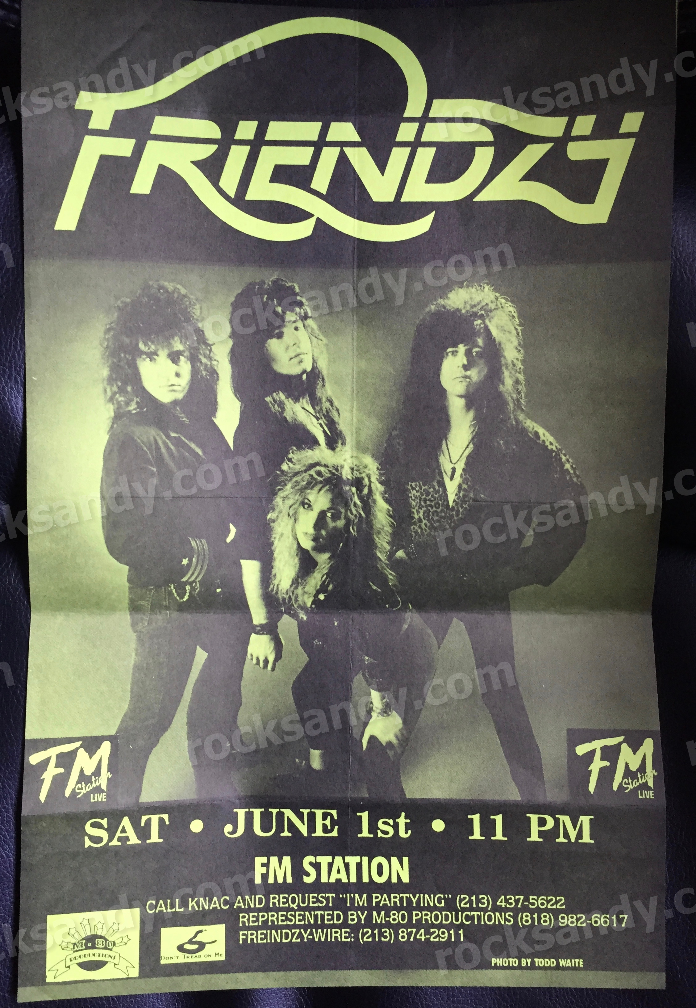 The FM Station was in North Hollywood (where I lived) – we had some good times and saw some good bands there. It was torn down a few years ago. About this band from my long-time pal and my son’s godfather, Brett Miller: “Friendzy featured Laurie Rox (my friend from Seattle), her husband Joey from Roswell NM on guitar (left), Greg from Rhode Island (center) drums, me (right) on bass. Headlined a few shows before imploding. Fun band. Ozzy Osborne was at this show and came to our North Hollywood band house after-party (with his bassist Mike Inez, now with Alice In Chains) and held court in Joey’s master bedroom where we granted audience to many friends to go in a talk to him one-on-one. I asked Ozzy if “Earth” was really Black Sabbath’s first name, and he said “No, it was the Polka Dot Blues Band” (truth). It was my last hurrah grabbing for the brass ring before I quit music and left for Computer Graphics vocational college. I’m never sorry I left Seattle to go for my dream. I got to play all the big famous clubs, Troubadour, Roxy, Whisky a Go Go. I was at Riki Rachtman’s Cathouse on opening night and every Wednesday after that. I made great friends from around the country, guys and girls, all of us feeling like we were living the dream. We were, and no matter how people might make fun of the hair band era, it was glorious. A year later Nirvana would happen. [Big thanks to my BFF Sandra Hebert who found this poster, and was there with all of us, an 80’s version of “Friends.”)” Good times, good times ;o).