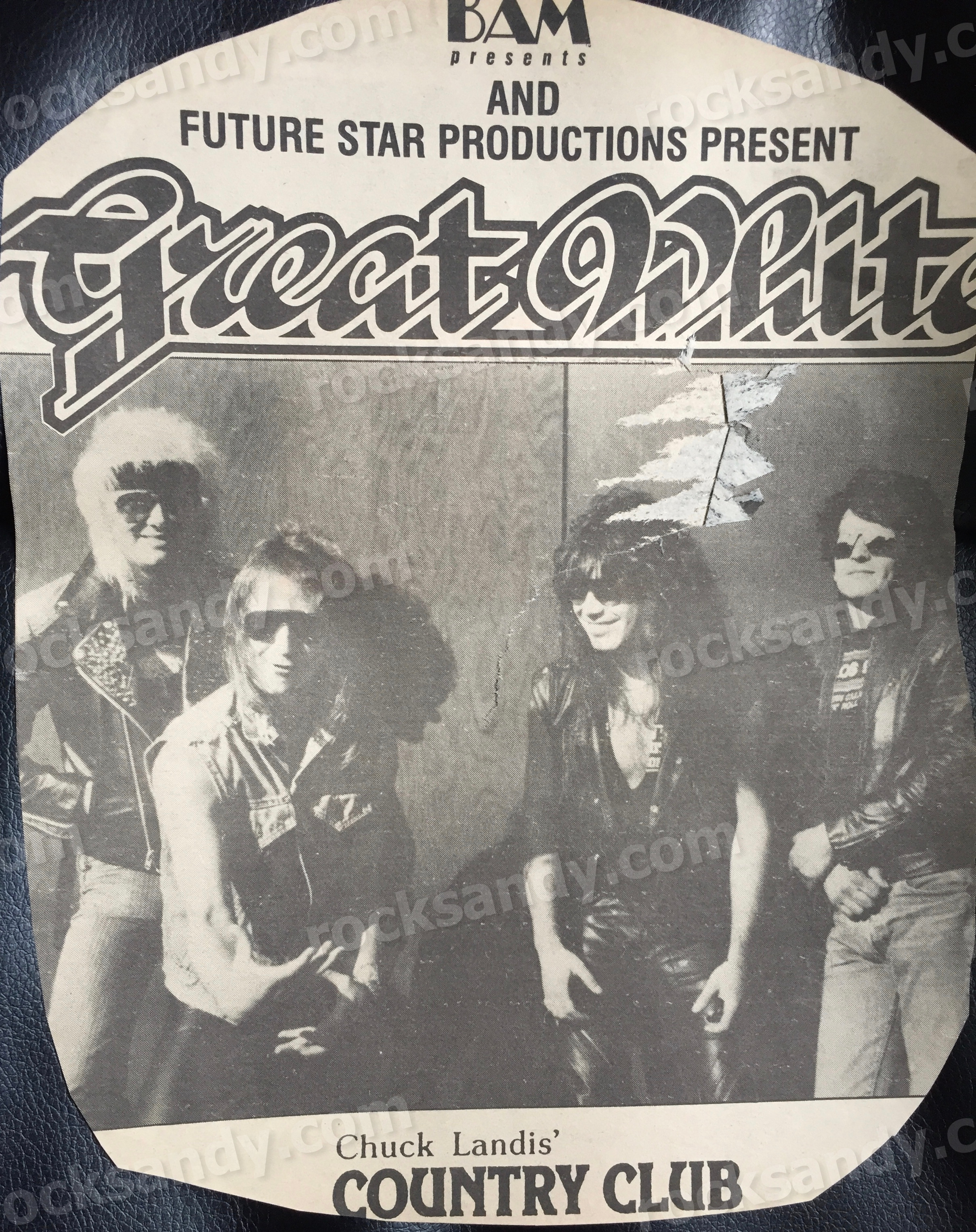 I remember we would drive all over to see Great White – my friend had a thing for Loren Black. This looks like it was taken from a magazine ad (likely BAM). The Country Club in Reseda had some great shows back in the day.