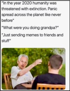 Are memes reminding us that laughter is the best medicine? If so, then humans are going to be just fine. I jest, but really, are memes not the best part of 2020, the way they make us laugh at ourselves? Talk about self-reflection. The best way to understand and document our new reality is through these brief but strikingly accurate portrayals of change. History books should include them to teach future students what humans were like during this era. They are ultra-amusing, often self-deprecating, always piercing truths of human beings getting jarred into a new reality. They have consistently kept me lolol.