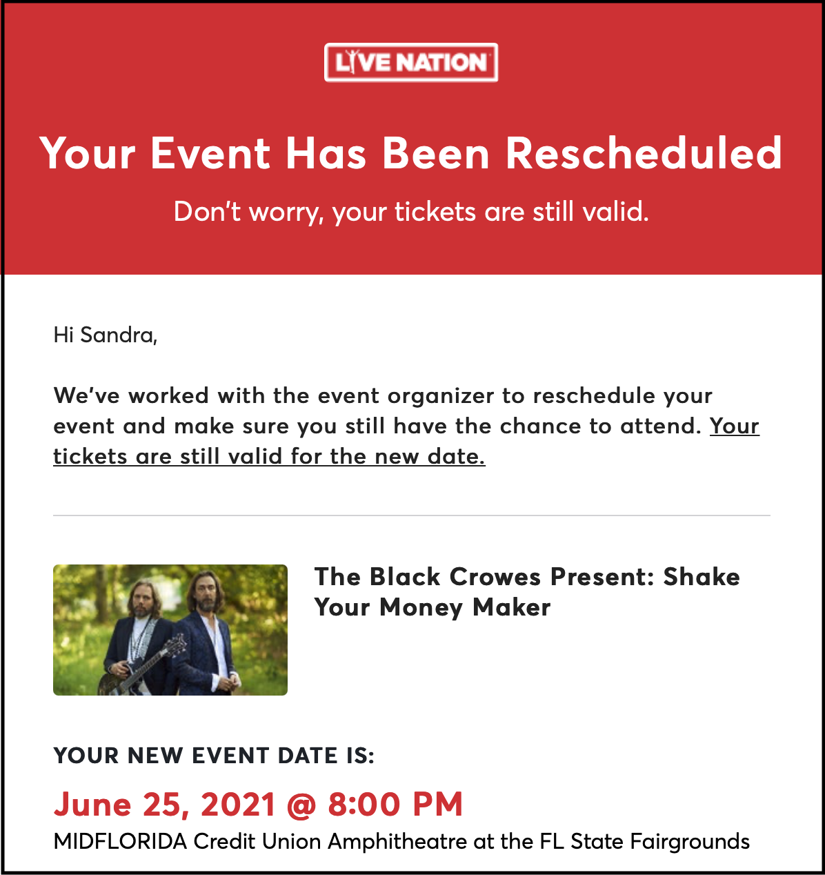 The Black Crowes were supposed to be on July 1, 2020 at the Midflorida Amphitheatre in Tampa, Florida. Cost $118.60 for pretty good seats. Rescheduled for 6-25-2020 and I sincerely hope things get better by then!