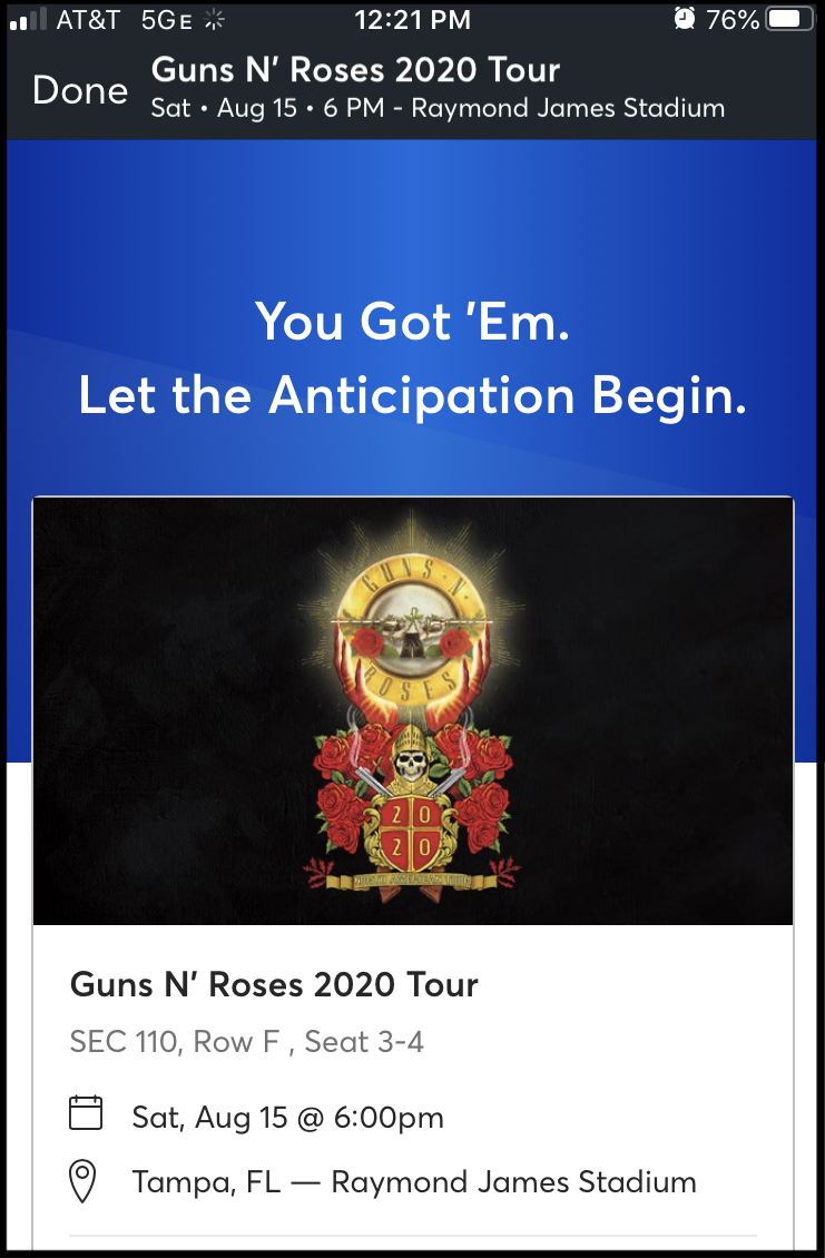 Guns N’ Roses was supposed to be on 8-15-2020 at Raymond James Stadium in Tampa, Florida. Cost $196.15. The show was cancelled. I saw them in 2016 out in the third tier boonies (check out my review of that show here) and decided to get better seats this time. Considering I was lucky enough to see them at the Cathouse and other L.A. clubs back in the ’80s, I can’t whine too much.