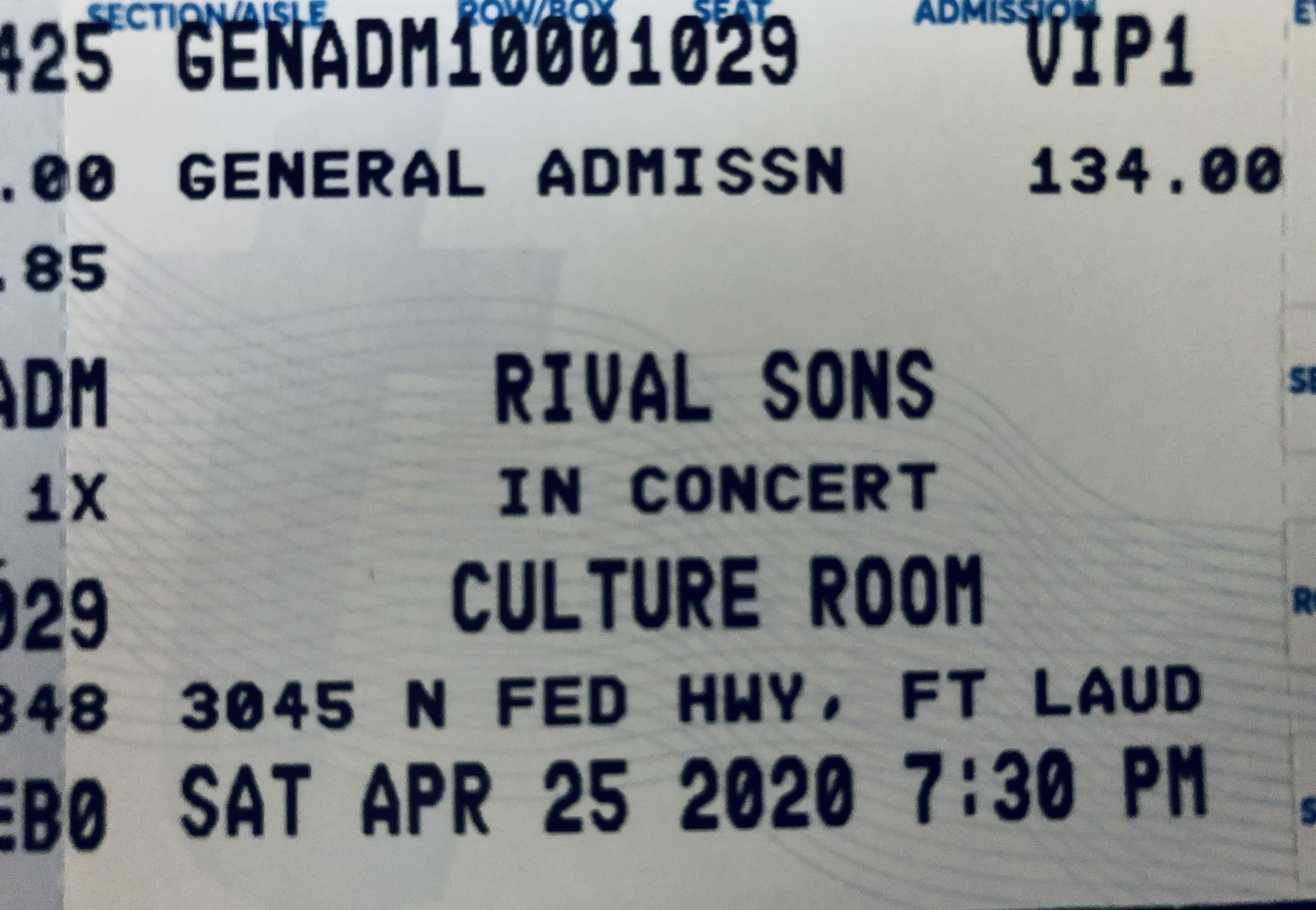 Rival Sons was supposed to be on 4-25-2020 at the Culture Room in Fort Lauderdale, Florida. Cost $145.85 for a VIP ticket that included sound check and a meet-n-greet. Sighhhhhhhh, squee, sob. No cancellation or rescheduled date yet. I will hold on to these as long as possible….MY FAVORITE BAND THESE DAYS!