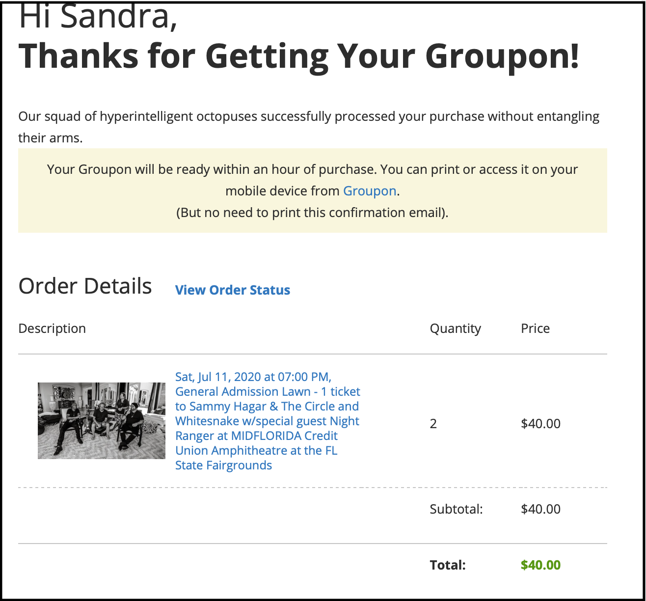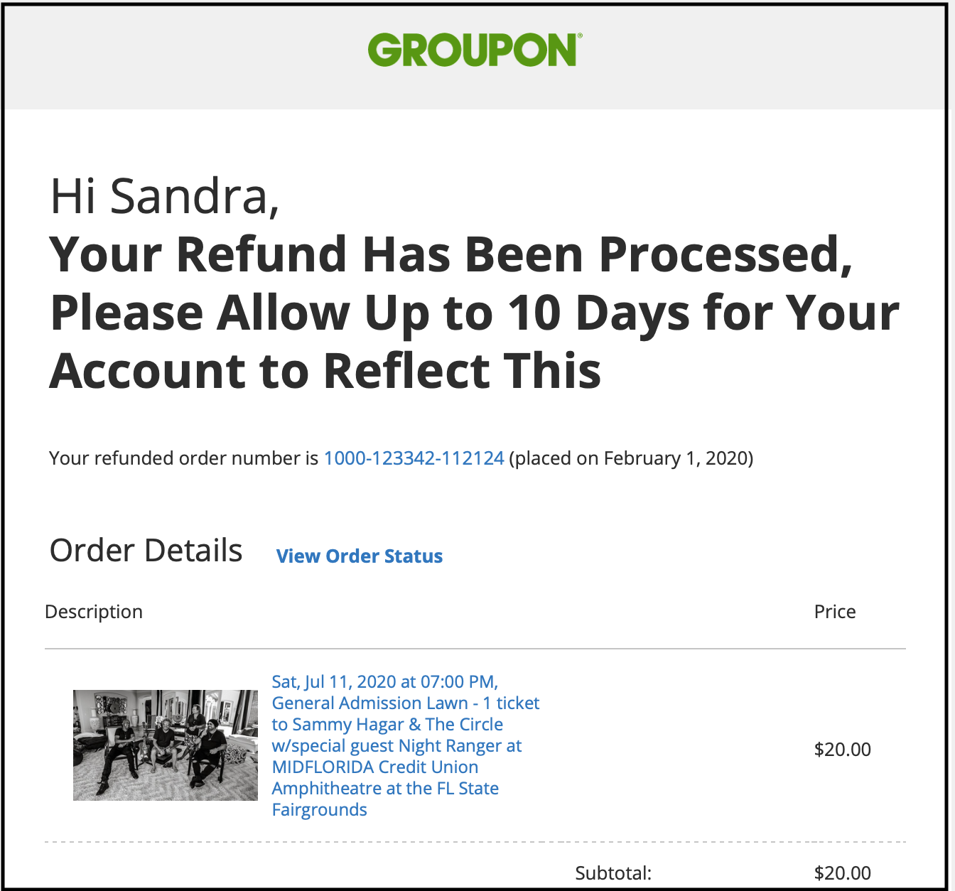 Sammy Hagar and the Circle, Whitesnake, and Night Ranger was supposed to be on 7-11-2020 at the Midflorida Amphitheatre. Groupon Cost $20. I also had really good seats to this show in Boston (my cousin is holding on to those tickets!) in August. Groupon Cost $20.00. The tour was cancelled.