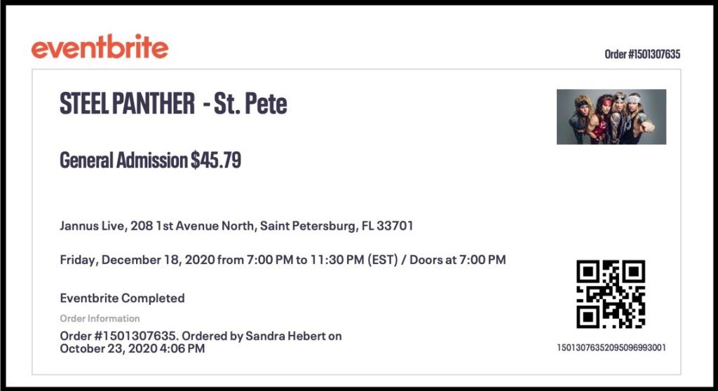 Steel Panther with Blackberry Smoke at Jannus Live on 12-18-2020. Cost $45.79. This show actually happened but I gave the tickets to a friend. I bought the tickets in a moment of desperate weakness in September, when things were looking a bit brighter pandemic-wise, as it was an outdoor show with limited capacity. Being it was so close to the holidays, we decided that we did not want to risk our families’ lives at Christmastime for Steel Panther (lol…we probably might have for Rival Sons). Fun comedic band to see though!