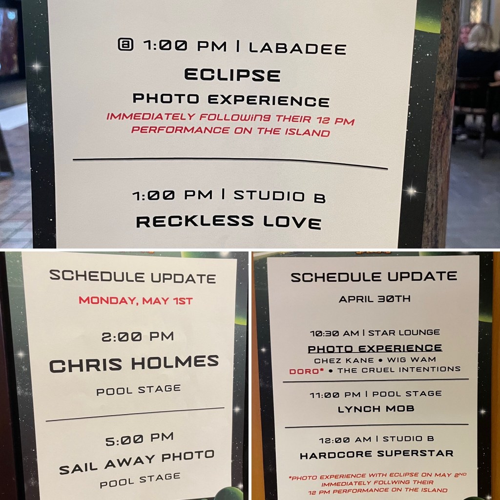 With the variety of venues, genres, eras, legends, originals, stand-ins, and replacement members, we each have to narrow down our preferences and priorities. And you got to mix in time for hanging with friends for food and drinks…it’s a fiesta for sure. You’ll find me at most ’80s band shows, but I enjoy checking out the rare or unknown stuff – it’s a great way to find new (or old) music and check out other genres and generations – and just have a great time on a ship full of like-minded music peeps from all over.
