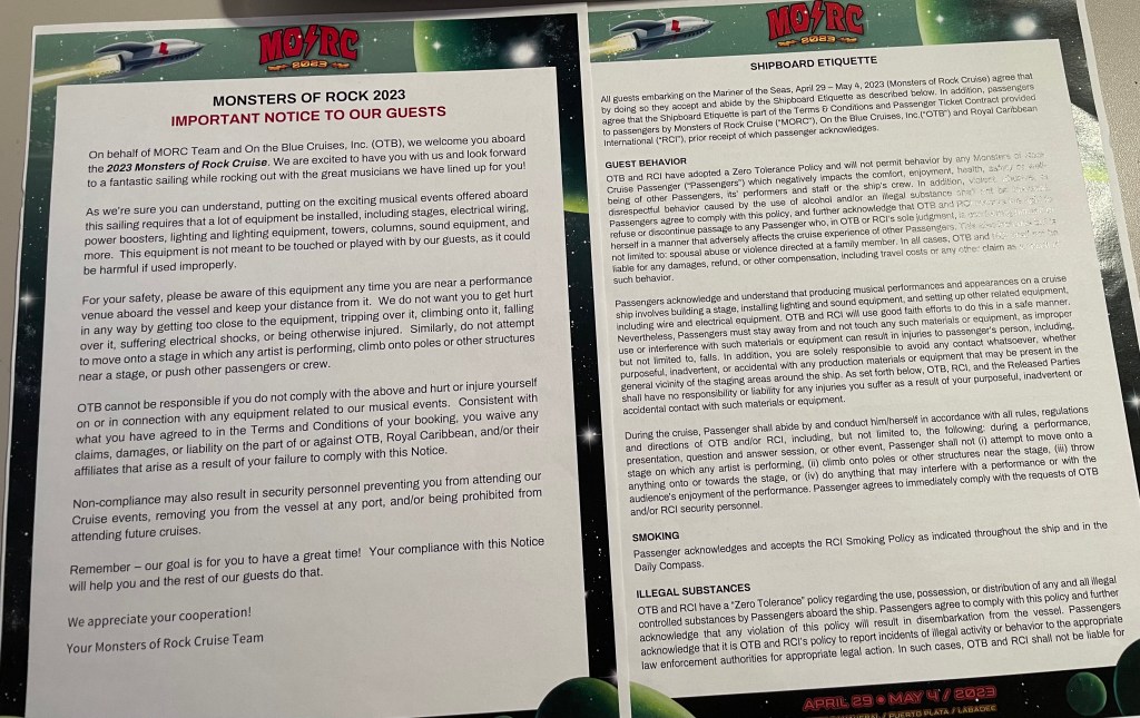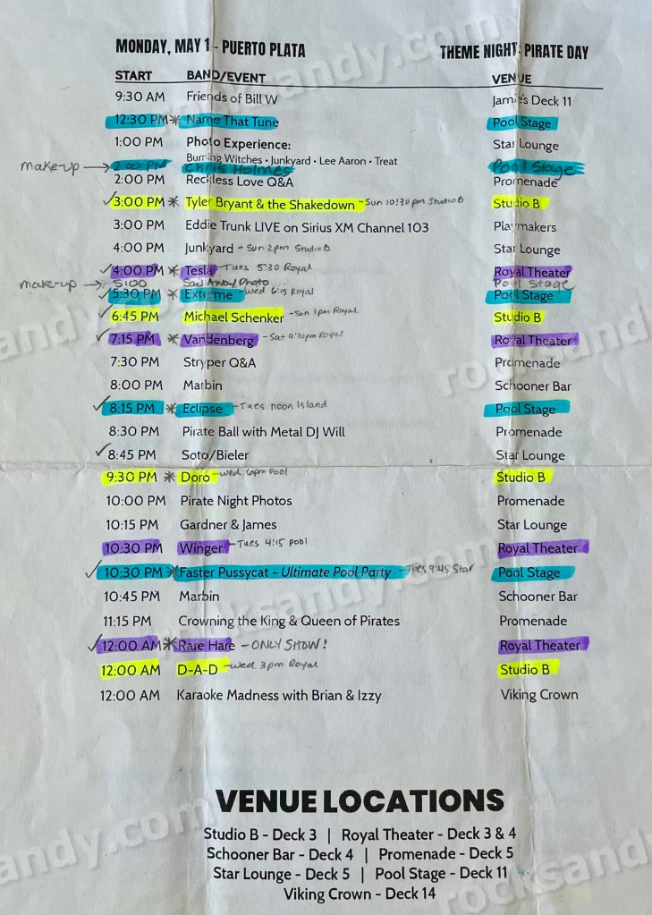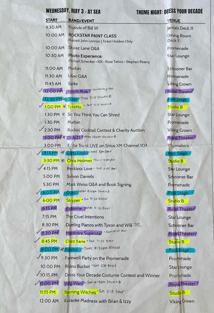 I’ve used various methods to keep track of where and what bands to see over the years, but it always involves me carrying around a daily band schedule for constant consultation (and passing around for discussion). I decided to wing it a bit on the 2020 MORC and won’t make that mistake again. This year I made a point of marking up each day and color coding by stage, with an asterisk next to the ones I planned to go to. I also made notes on venue options and unknown/unseen bands. Some cruisers make complex spreadsheets – whatever works for you to stay on top of it all.