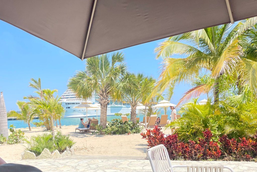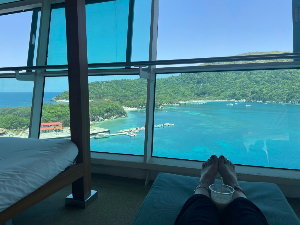We got off the ship for a short visit to Royal Carribean’s lushly-landscaped and beachy enclave in Puerto Plata, Dominican Republic, and enjoyed a frozen cocktail in the muggy shade with a view. We stayed on ship during our visit to the lovely mountainous island of Labadee, Haiti, having visited and explored it in a previous stop. A frothy cocktail in a comfy cabana overlooking the island was great chill time.