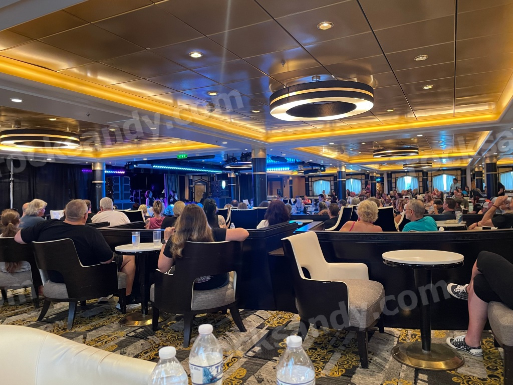 We boarded Royal Caribbean’s Mariner of the Seas easily Saturday morning, as always all happy to be in the company of ‘our people’ in ecstatic vacation mode. Shortly after getting situated on ship, an early Florida summer storm set in to show off her might with crazy winds and lightning, causing the pool deck to be evacuated. The weather moved the unfazed party into the normally quiet casino, which became a busier-than-usual gathering spot between Studio B and the Royal Theatre venues, and the Promenade and Schooner Bar bustled more than usual. It was great for running into friends from over the years.