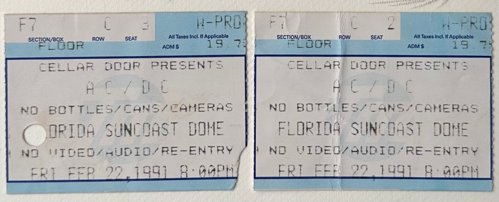 ABOVE: AC/DC with King’s X on 2-22-1991 at the Florida Suncoast Dome (now Tropicana Field) in St. Petersburg, Florida. Floor seats, Section F7, Row C, looks like $19.75. Yet another cool band archival concert data site can be seen at ac-dc.net. I actually remember (wow, lol) being backstage at this show but I think the King’s X backstage pass I had was accidentally assigned to a King’s X show in my 1990 post.