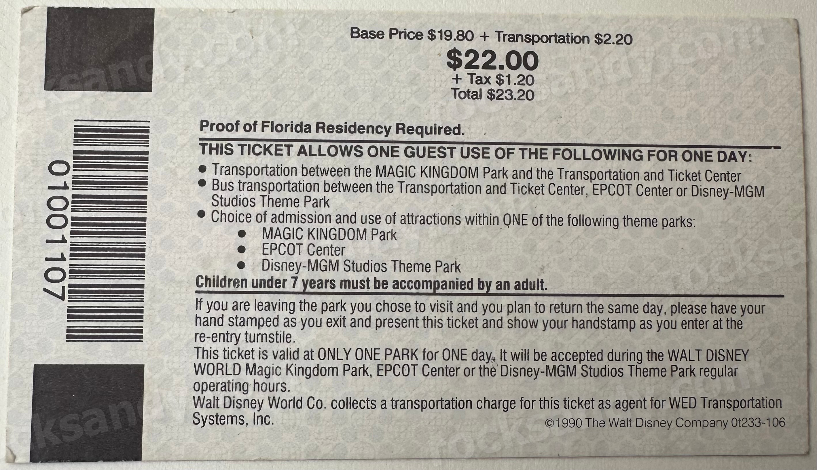 ABOVE: Since it’s in my album I’ll throw this one in for the price shock: Walt Disney World Florida Resident One Park/One Day Ticket on 5-26-1991 for $23.20.