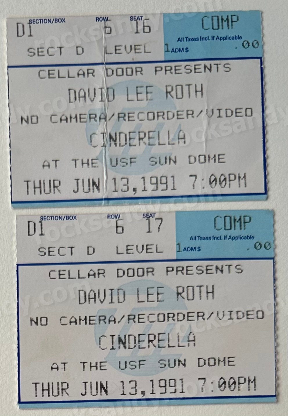 ABOVE: David Lee Roth with Cinderella and Extreme on 6-13-1991 at the USF Sun Dome in Tampa, Florida. Comped tickets with a Cinderella Heartbreak Station “Before Show” backstage pass.