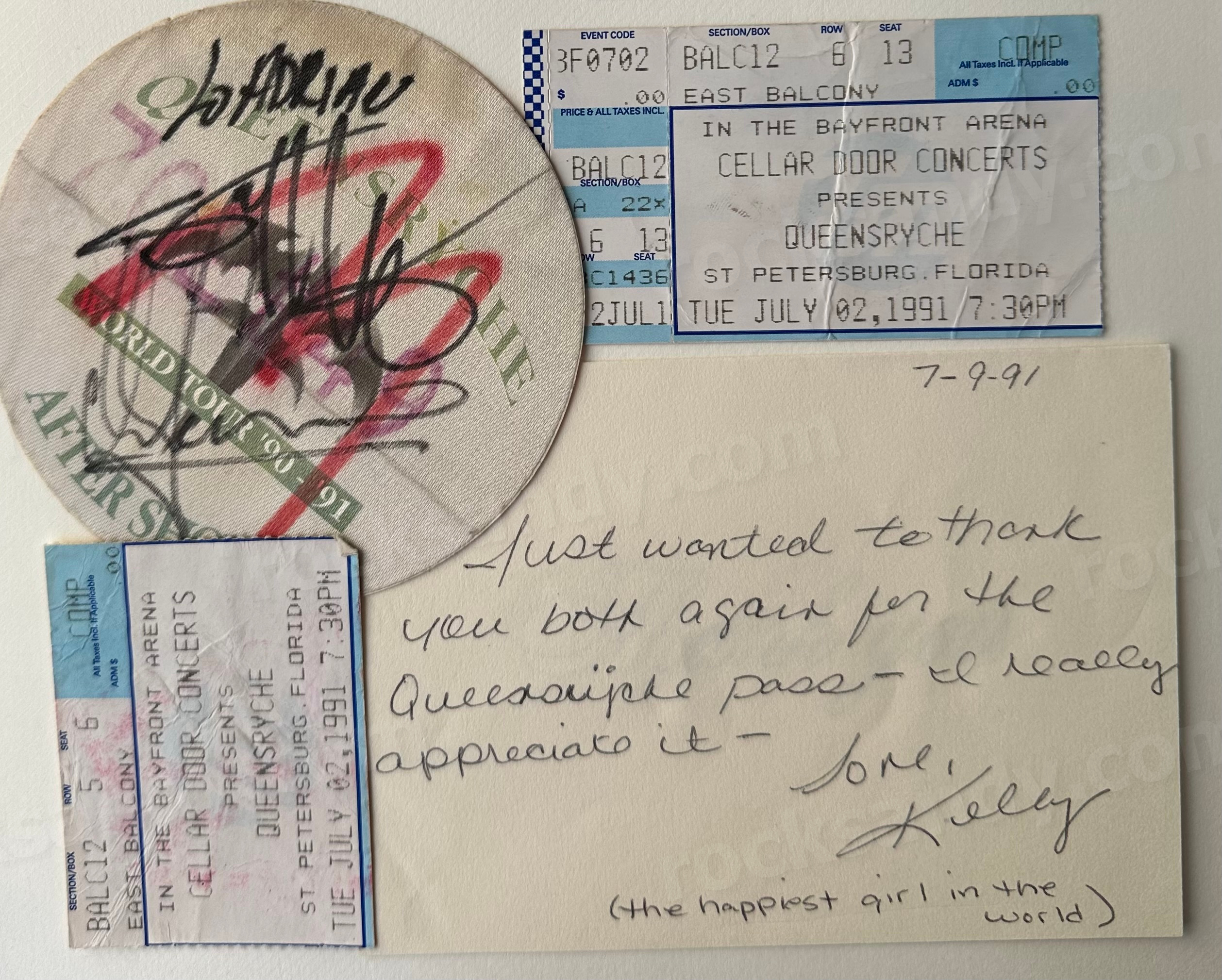 ABOVE: Queensryche with Suicidal Tendencies on 7-2-1991 at the Bayfront Arena in St. Petersburg, Florida. Two comped tickets and an autographed Queensryche World Tour ’90-’91 AFTER SHOW backstage pass, along with a note from a rabid-Queensryche-fan friend we took to the show and to the meet and greet. RIP, Kelly. This was the most amazing backstage experience ever: a few band members did an acoustic version of Silent Lucidity in front of a small group in a cement block room somewhere in the Bayfront Center. I wish I remembered more details; sigh…whether it’s just bad memory banks or not being “in the present moment,” I do remember it was one of the best backstage treats I’d ever experienced.