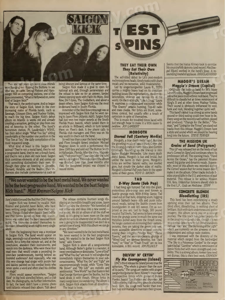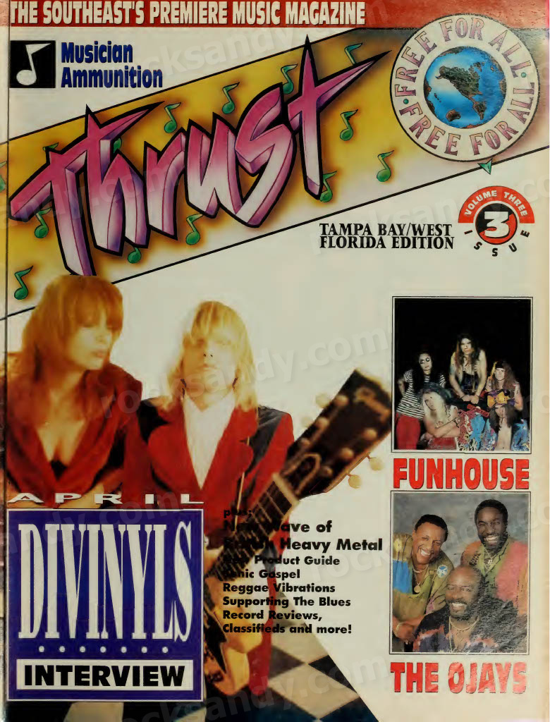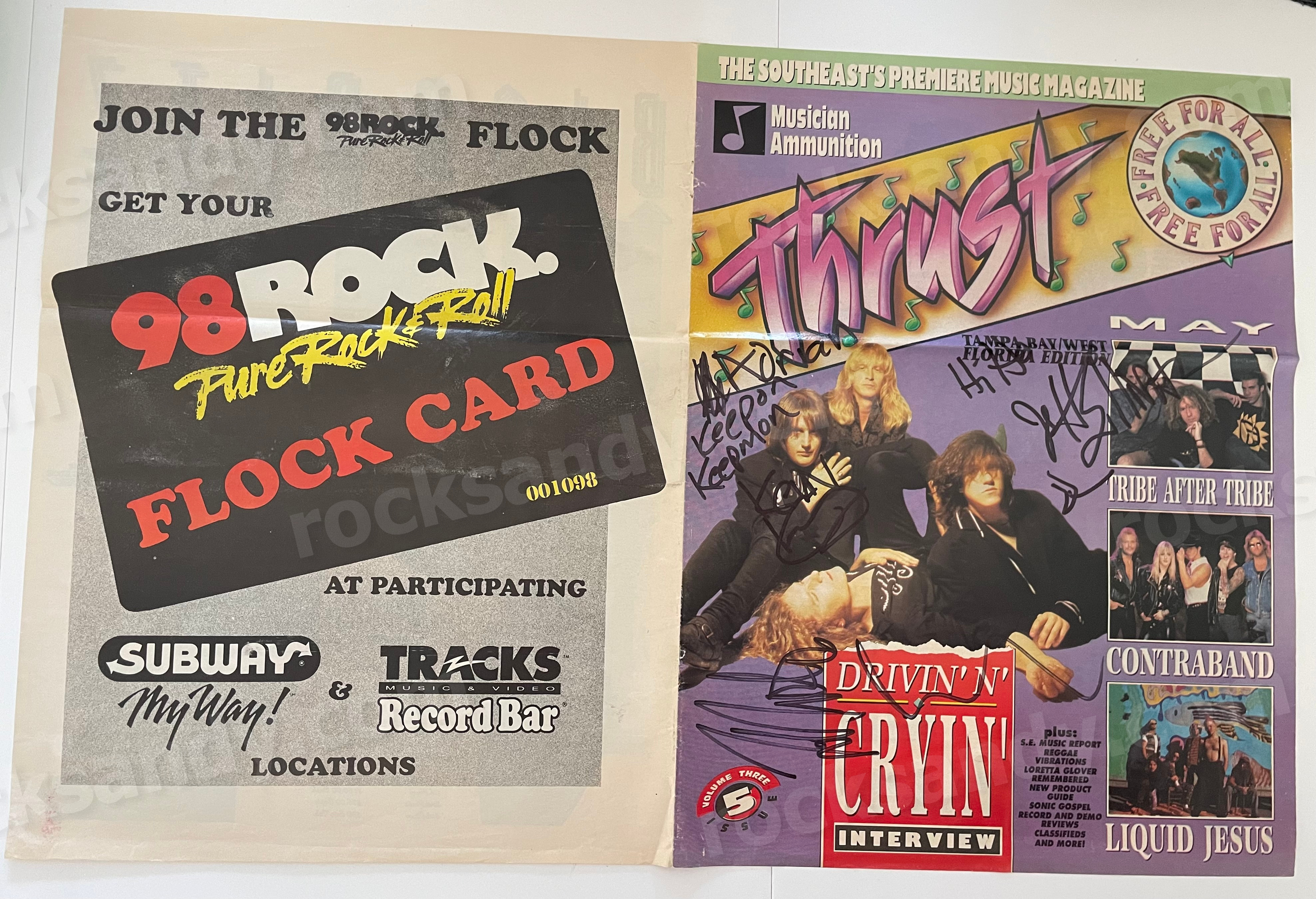 ABOVE: The May issue of Thrust featured Drivin’N’Cryin’. I remember going with Chris to this interview, which took place on the tour bus. One thing stands out clearly in my mind: the singer said he had just sent money home for a layaway payment on a swing set for his kid, who was around the same age as ours ;o). I’ve included that interview. Who remembers the 98 Rock Flock Card? I still have mine (of course lol – check out my post at 1982-1987 Tampa Bay Area Band Flyers).