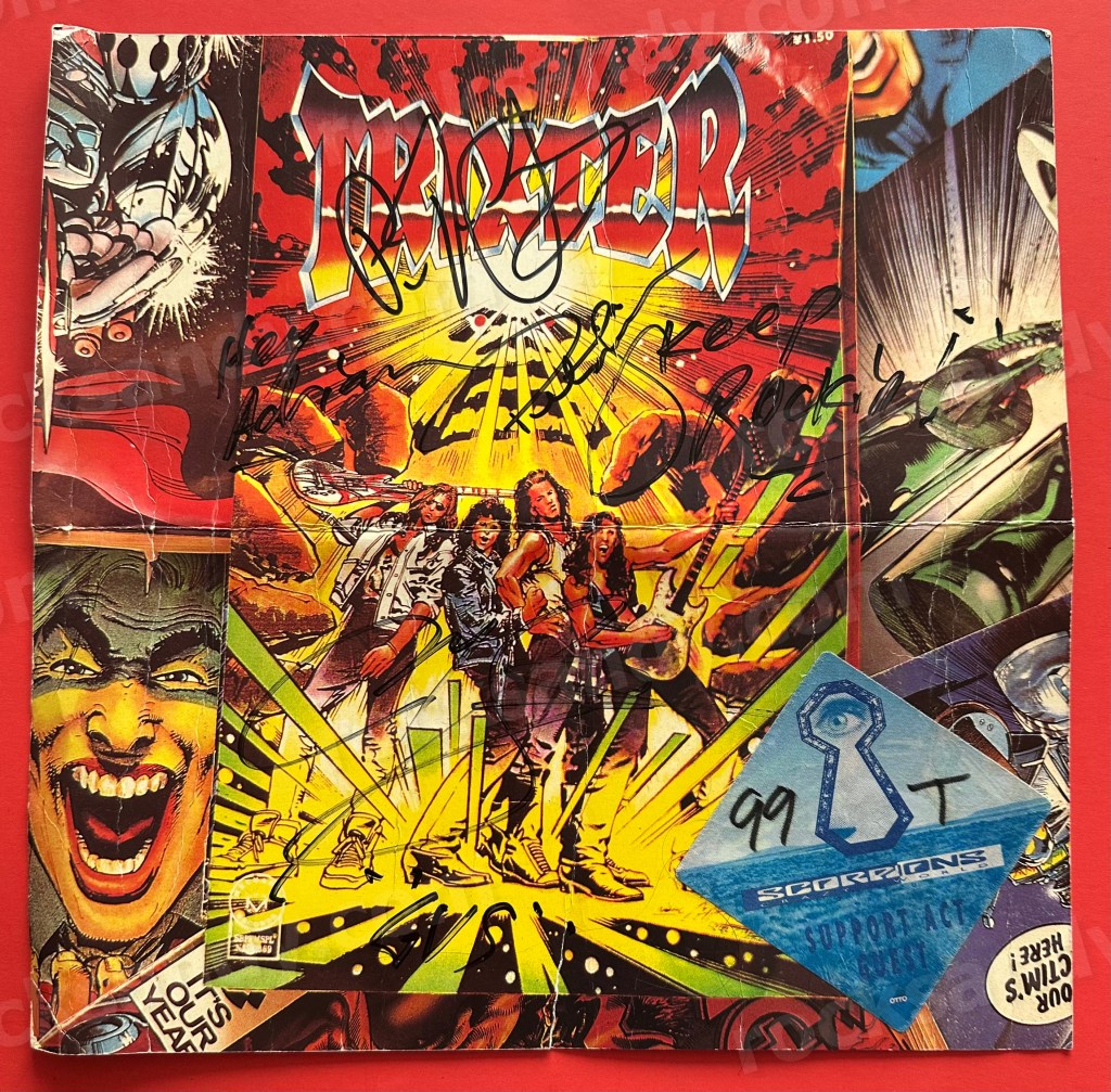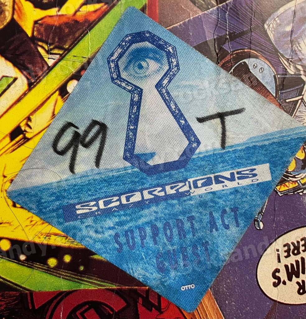 ABOVE: Scorpions with Trixter and Great White on 5-25-1991 at the USF Sun Dome in Tampa, Florida. One ticket is comped and the other is a floor seat Row L at $18.75. Autographed Trixter 12″x12″ cardboard promo piece (photo of front and back) with a Scorpions “Support Act Guest” backstage pass stuck to it.