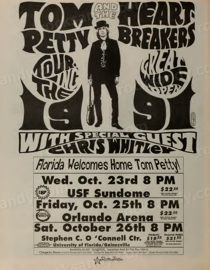 ABOVE: Tom Petty and the Heartbreakers with Chris Whitley on 10-23-1991 at the USF Sun Dome in Tampa, Florida. Comped ticket. Also a Thrust advertisement for several Tom Petty Florida shows.