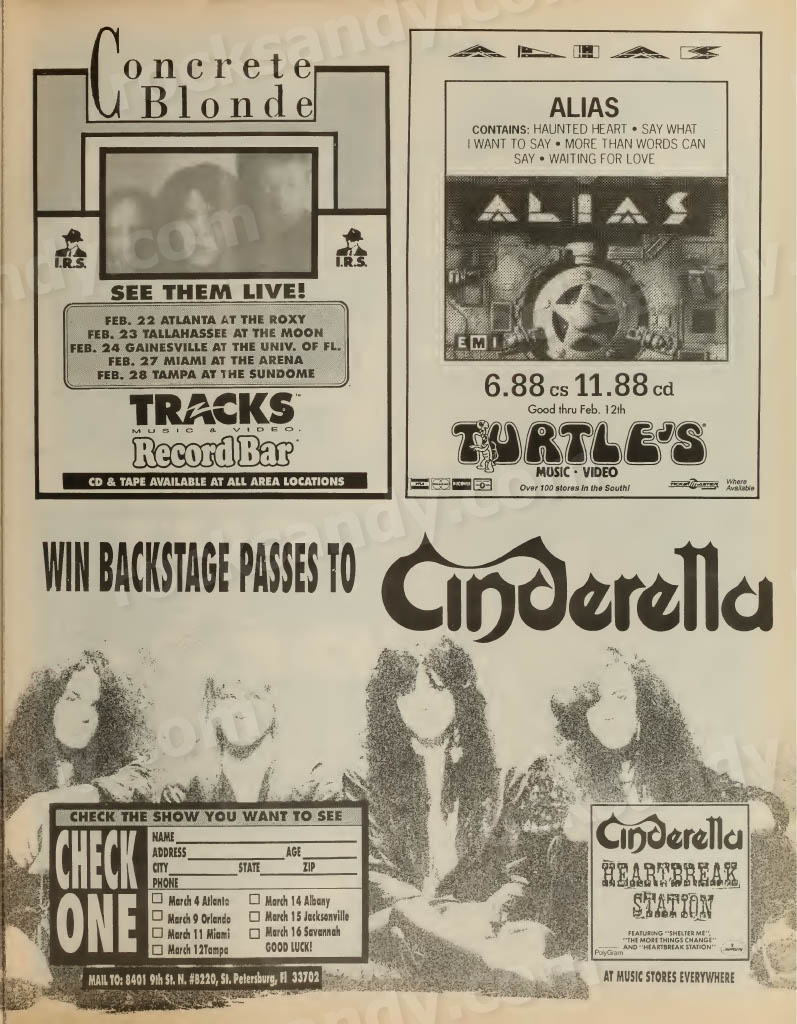 ABOVE: The January issue of Thrust music magazine featured Kings X with substories on The Simpsons, Killing Joke, Tesla, and the Cocteau Twins. The King’s X interview in that issue is included. The Bleeding Hearts with St. Warren and Belle Vue Boyz on 3-1-1991 at Jannus Landing in St. Petersburg, Florida. $4.98 advance/$6.98 day of show. And a few record store album release ads, reminding us we had to go to the store to get our music back then: GWAR at Peaches, Concrete Blonde at Tracks/Record Bar, Alias at Turtles, and a “Win Backstage Passes to Cinderella” ad, whose album could be found “at music stores everywhere.” Also included is a Dezo Hoffman photo exhibit ad and the monthly installment of The Great American Stiff, the punk/hard core scene update. #RIPstiff.
