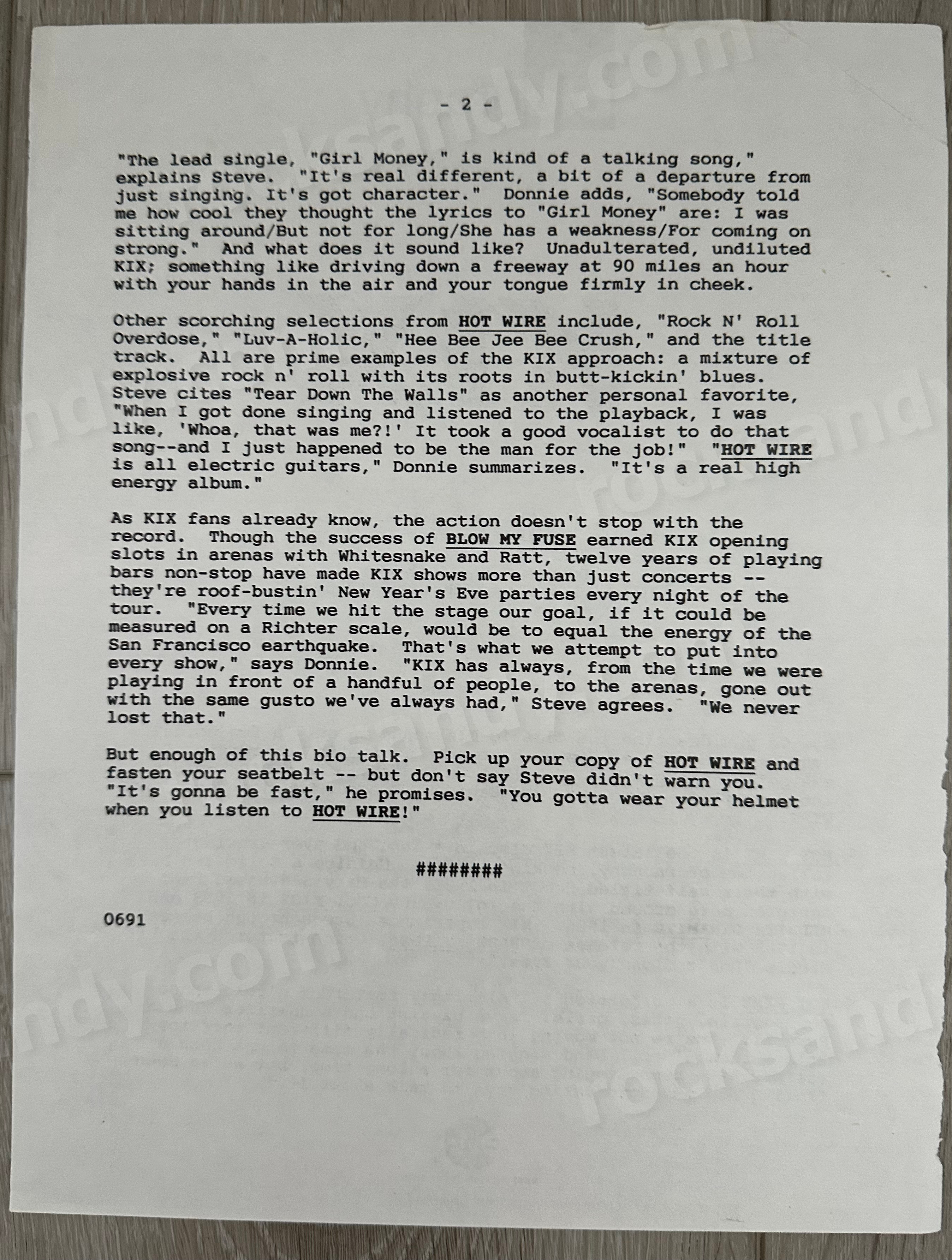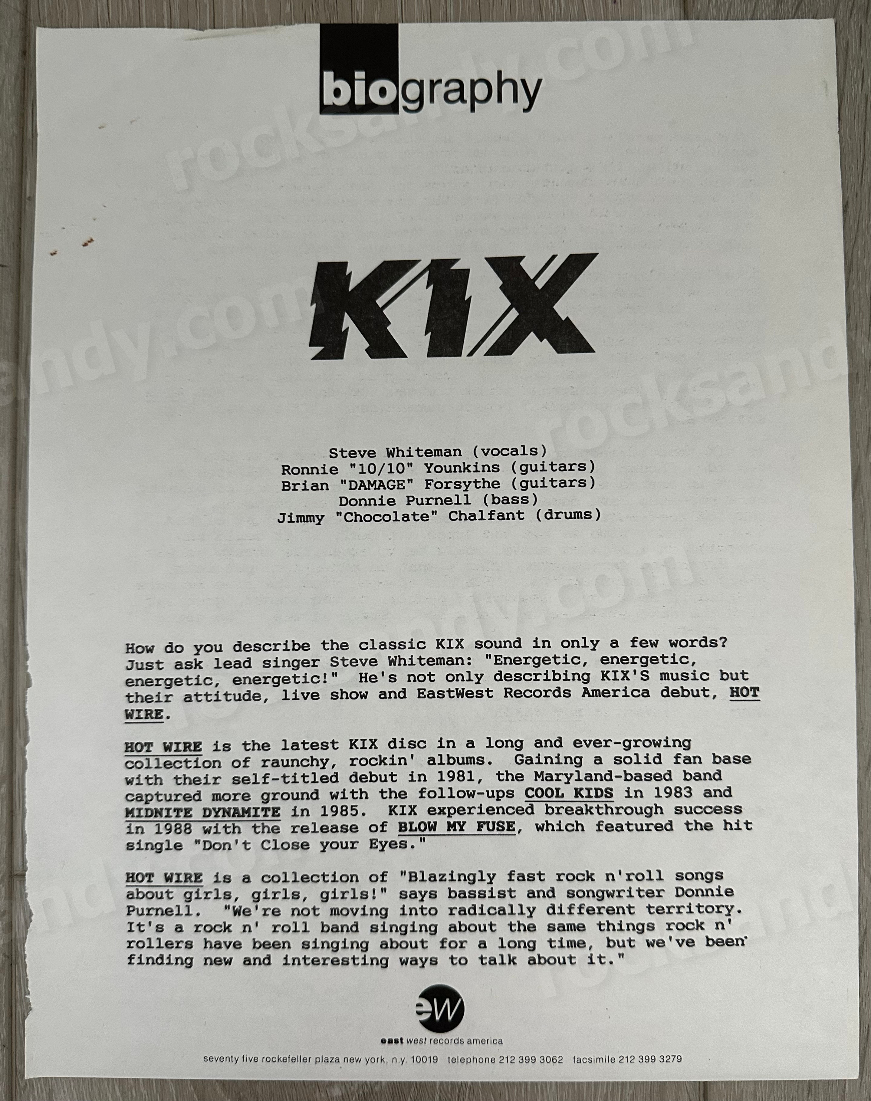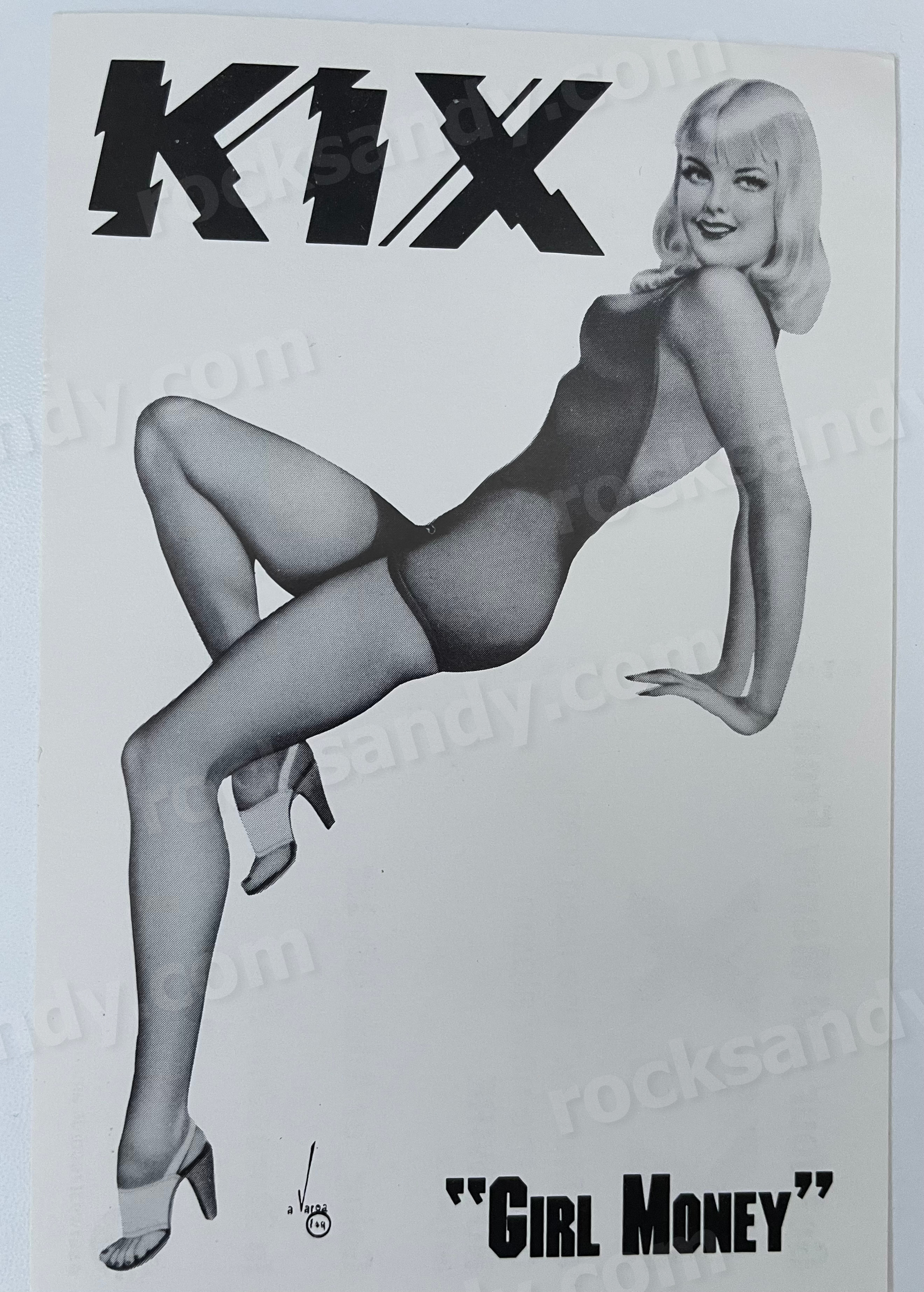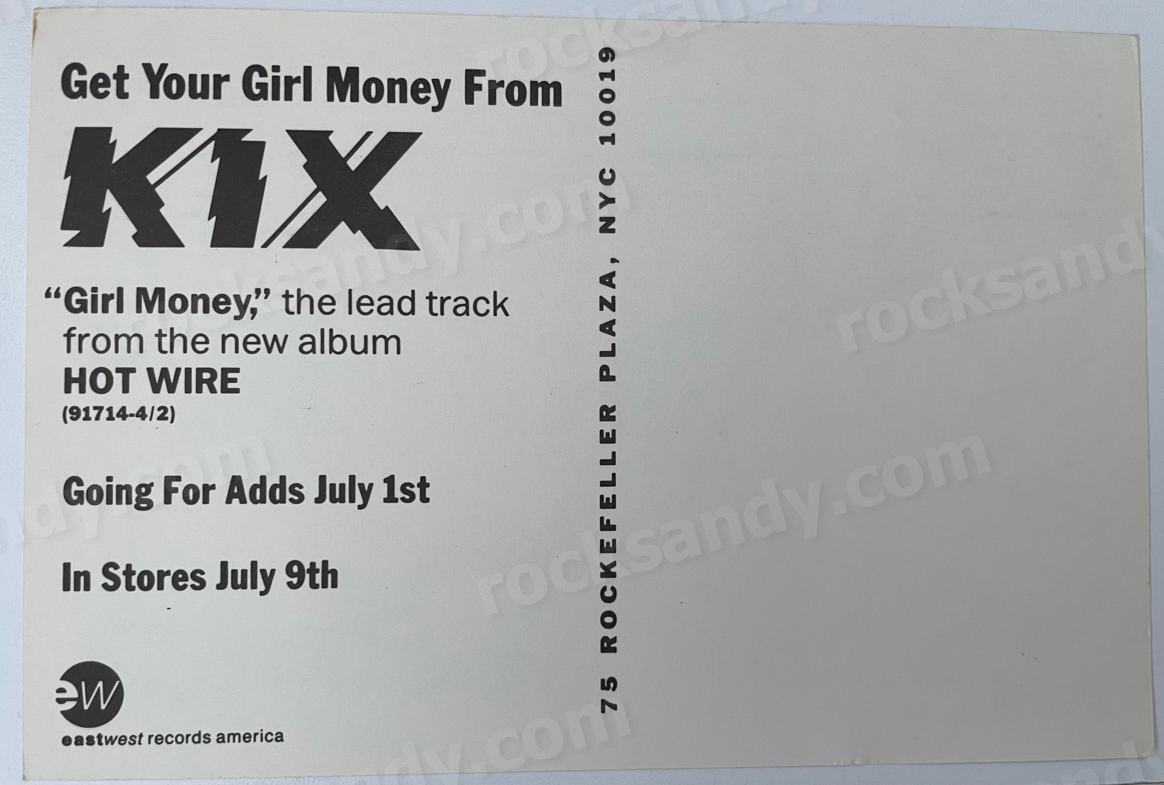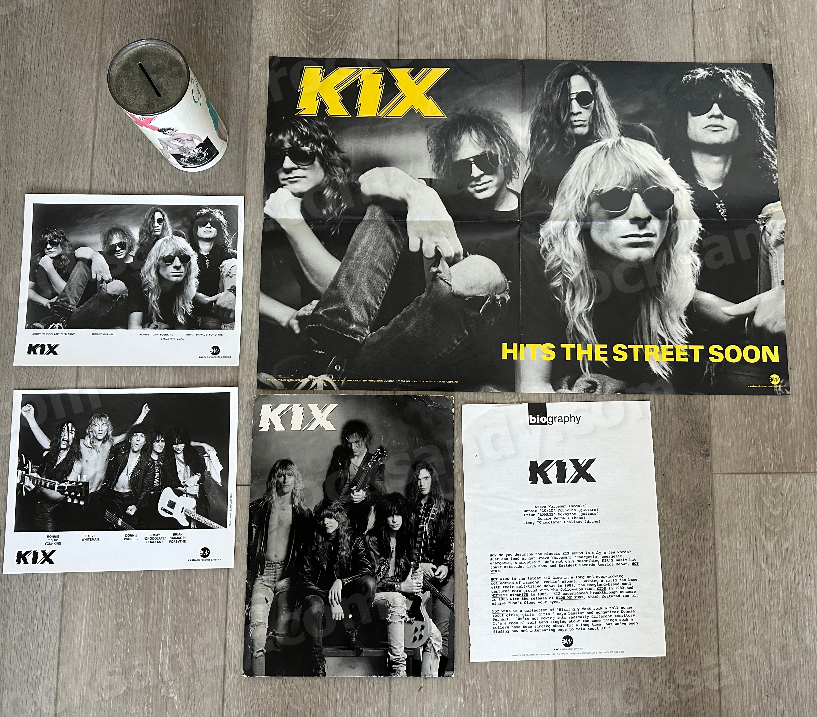 ABOVE: Kix 1991 Hot Wire album release press materials, including the coveted Girl Money piggy bank. The Girl Money front/back is postcard size, and the band poster is 15″x 24″.