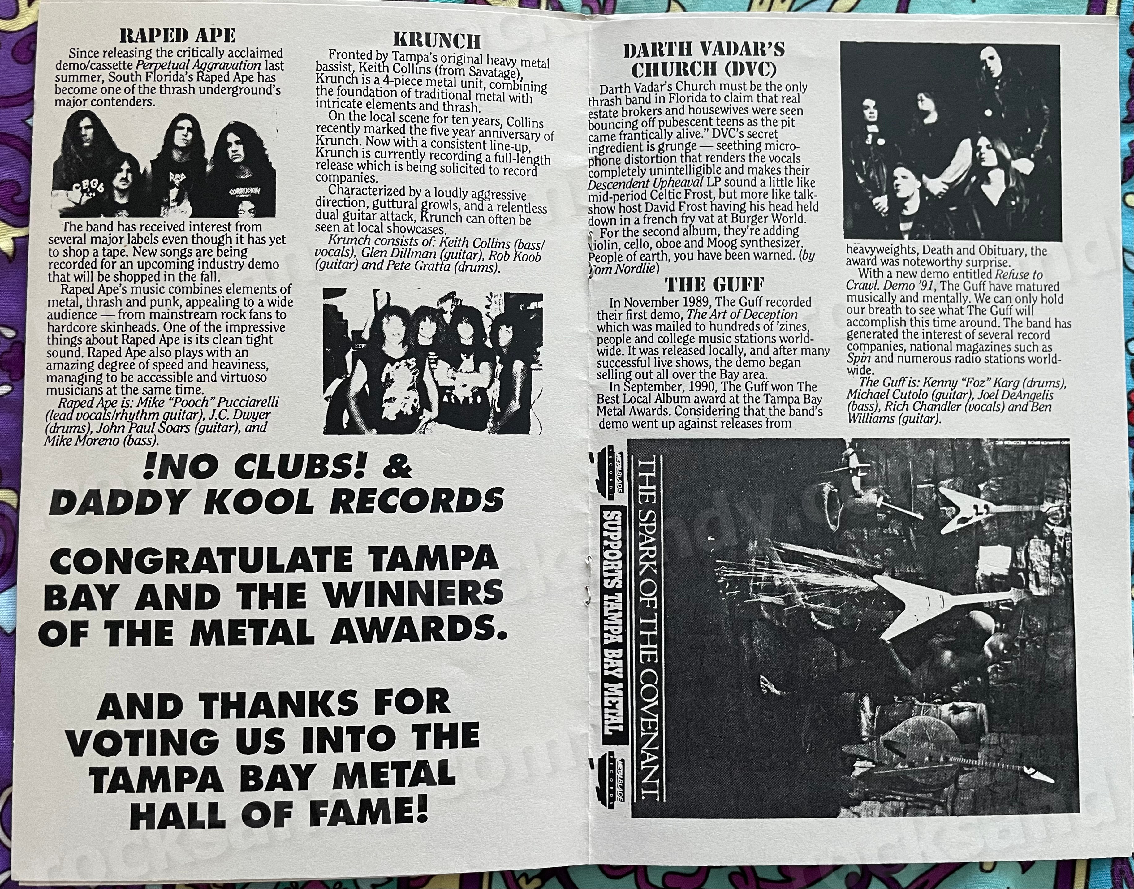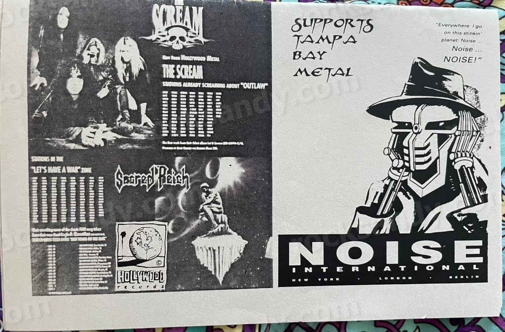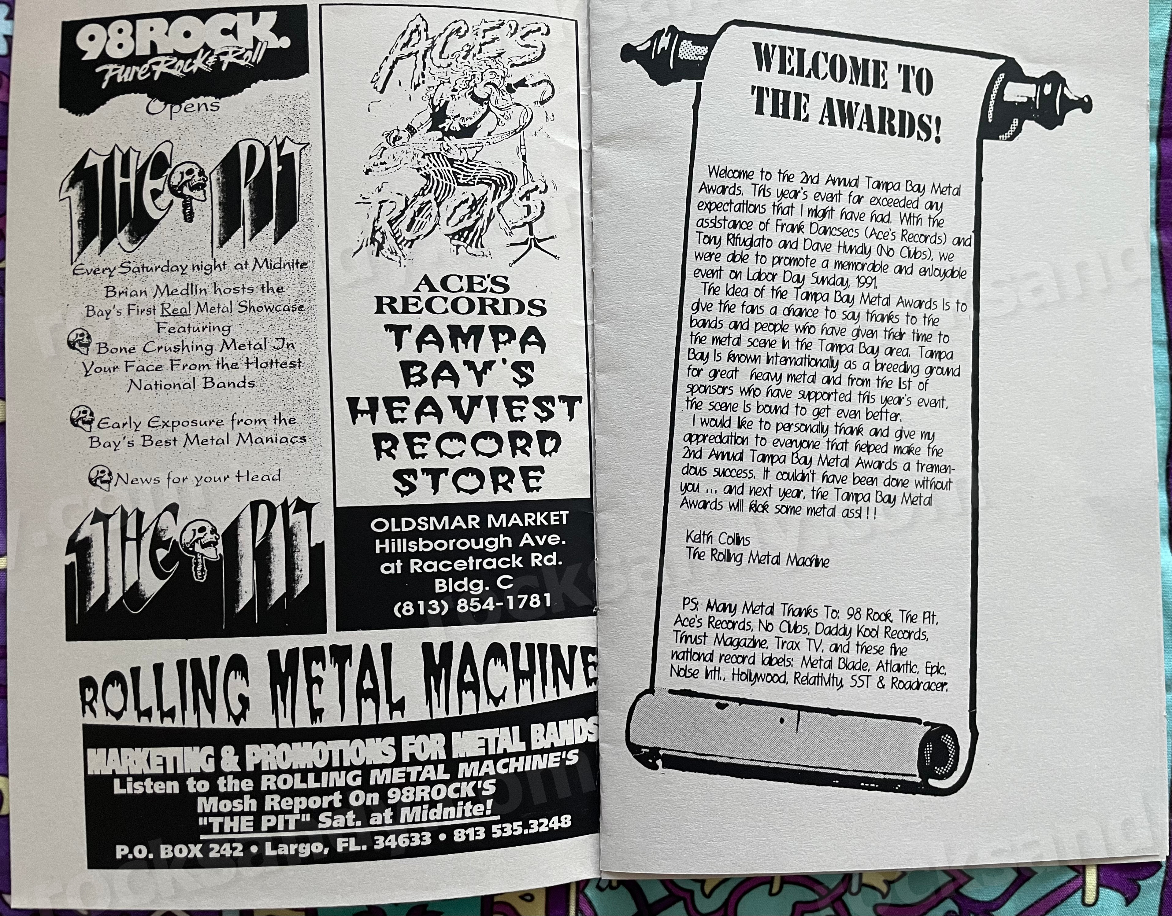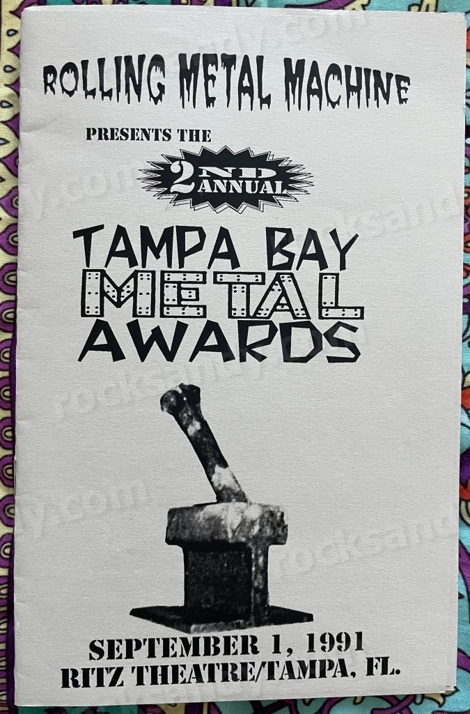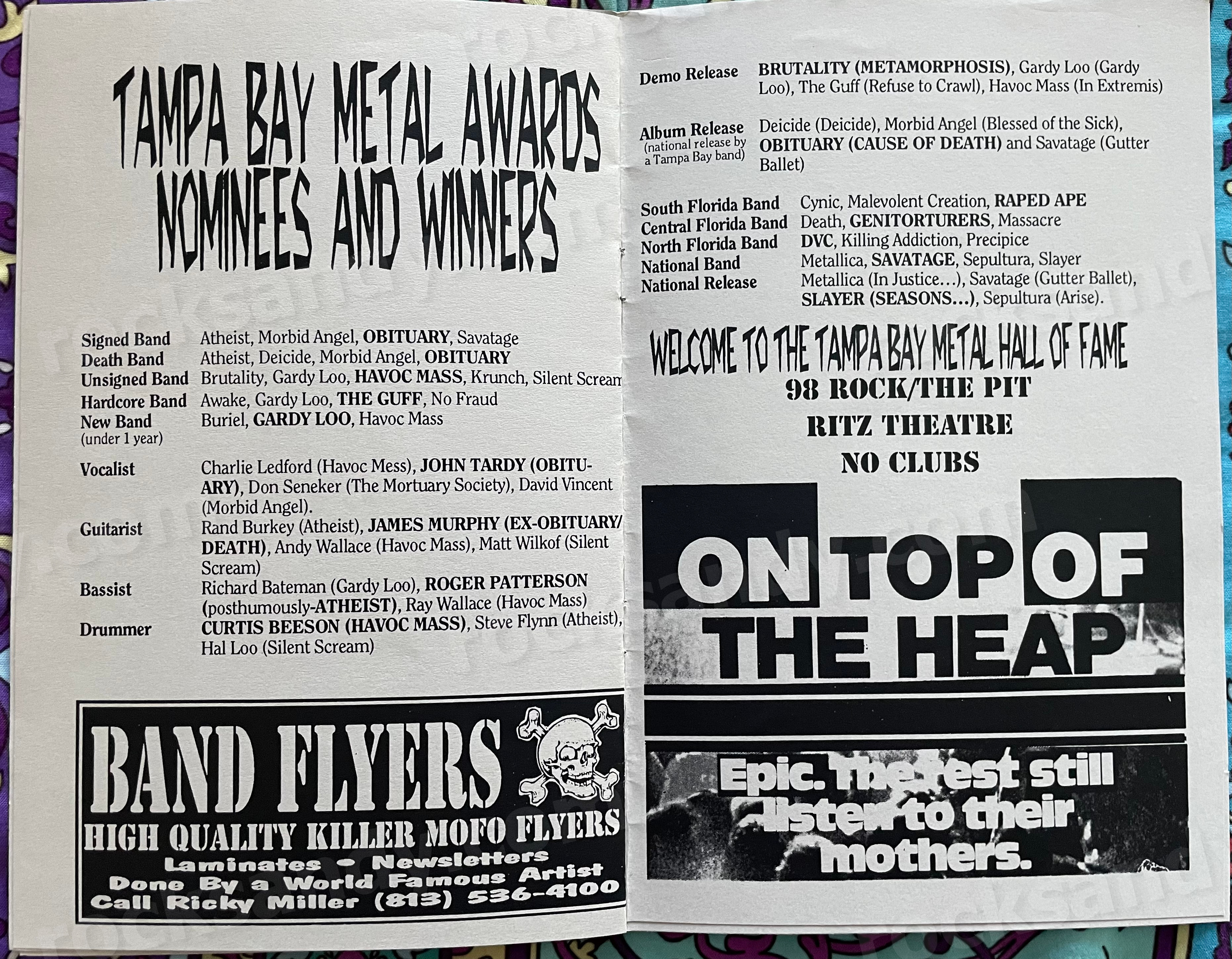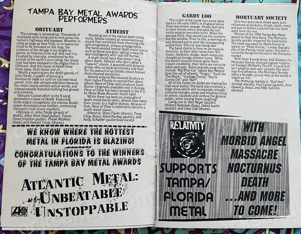 ABOVE: Program from The Tampa Bay Metal Awards on 9-1-1991 at the Ritz Theater in Tampa (Ybor City), Florida. Memories of 98 Rock, Ace’s Records at the Oldsmar Market, Keith Collins, No Clubs Productions, Daddy Cool Records, Trax video show, SST Records, Road Racer Records, and Thrust Magazine. Performances by Obituary, Atheist, Gardy Loo, Mortuary Society, Raped Ape, Krunch, Darth Vadar’s Church (DVC), and The Guff. The nominees and winners included Signed Bands: Atheist, Morbid Angel Obituary (winner), and Savatage; Death Bands: Atheist, Deicide, Morbid Angel, and Obituary (winner); Unsigned Bands: Brutality, Gardy loo, Havoc Mass (winner), Krunch, Silent Scream; Hardcore Bands: Awake, Gardy Loo, The Guff (winner) and No Fraud; New Bands: Buriel, Gardy Loo (winner) and Havoc Mass. Other musicians and regionalized band winners are listed as well. The back features a Hollywood Records ad for The Scream and Sacred Reich.