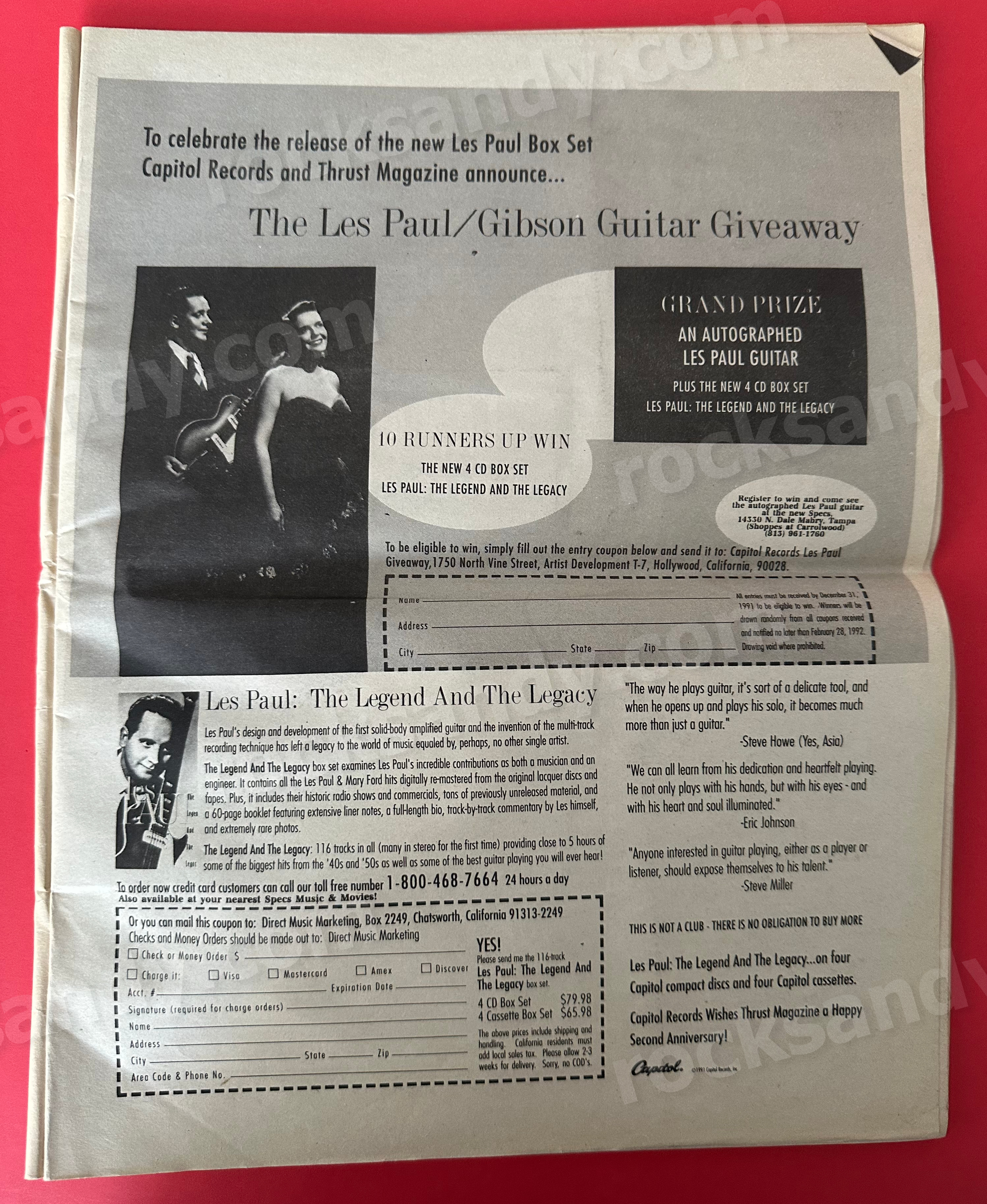 ABOVE: Les Paul autograph on his interview page from the November issue of Thrust, along with a related contest.
