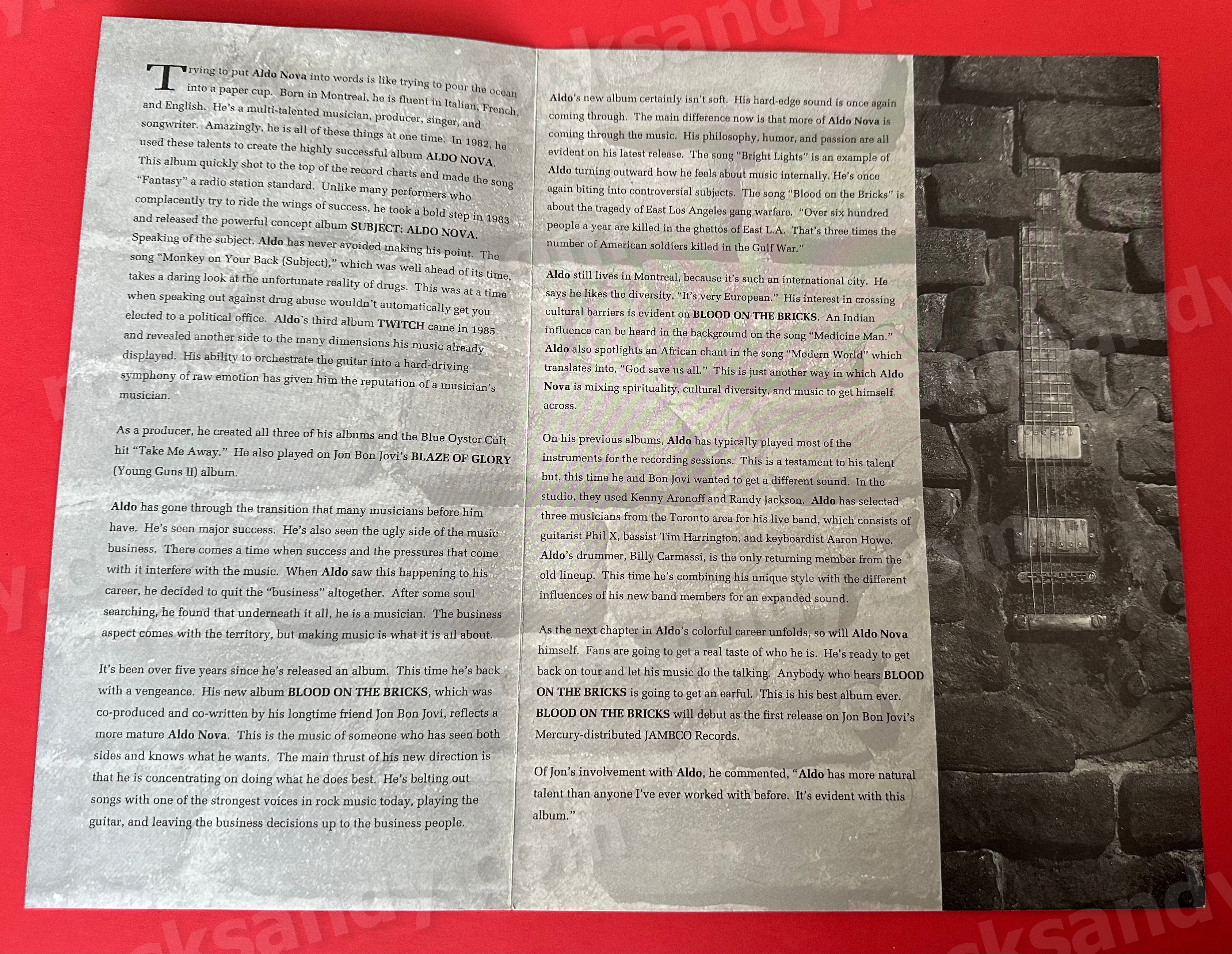 Above: Press kit for Aldo Nova‘s 1991 release Blood on the Bricks. A great album, even though my favorite will always be 1983’s Subject – my very favorite road trip album. The first and only time I saw Aldo Nova was 1982…and the second time will be on the Monsters of Rock Cruise in March, 2025. Looking forward to it!