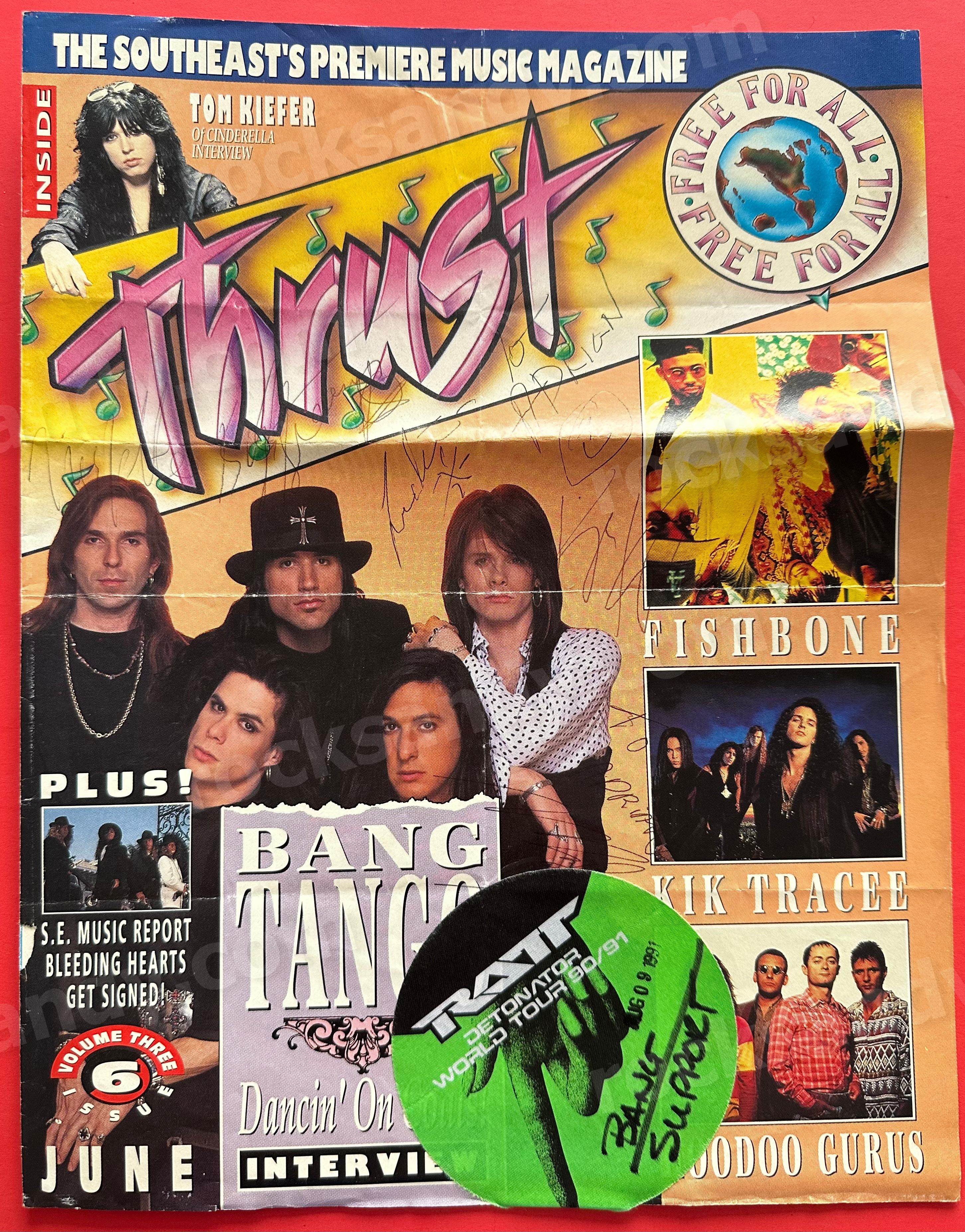 The June issue of Thrust featured Bang Tango with with sub stories on Fishbone, Kik Tracee, and Voodoo Gurus. A 8-9-1991 Ratt Detonation World Tour 90/91 support act – Bang Tango – backstage pass is stuck to the cover. See more on that show under August below.